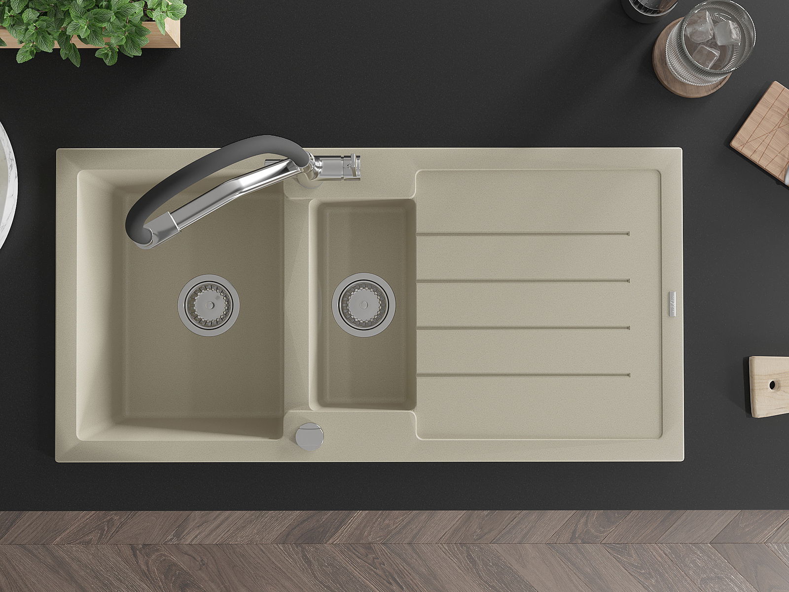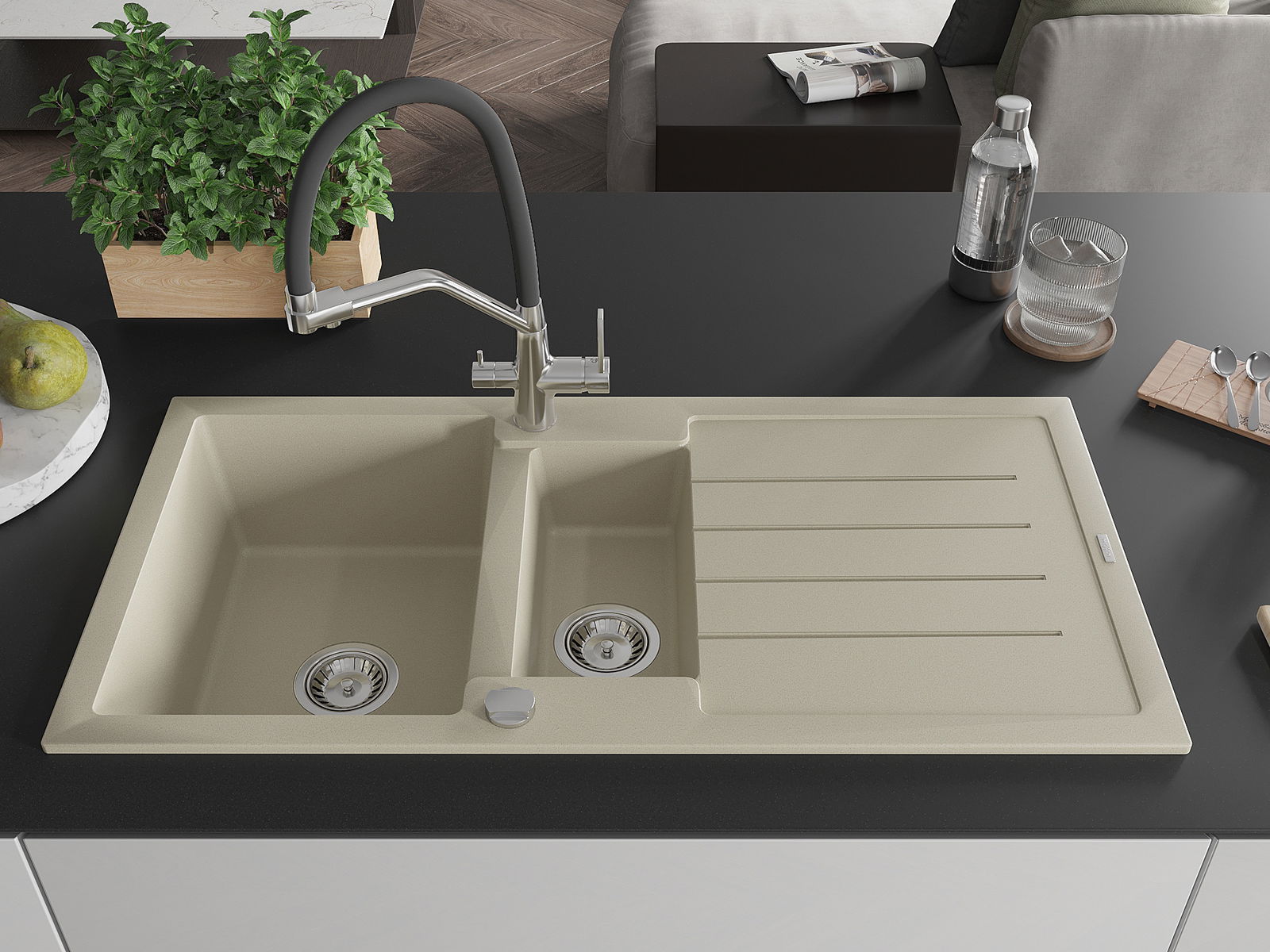 Suprafața chiuvetei este rezistentă la pete și decolorarea, datorită căreia este ușor de curățat și își păstrează culoarea mult timp. Estetică și practic completarea fiecărei bucătării.