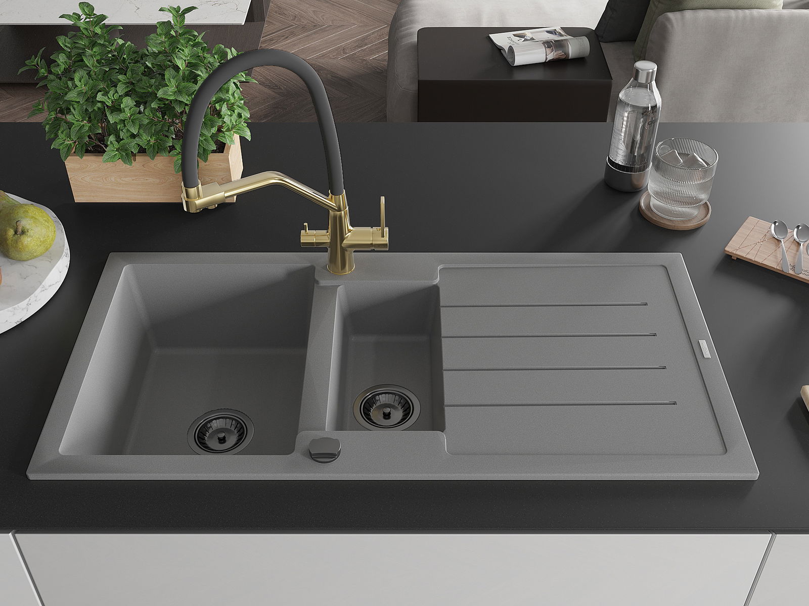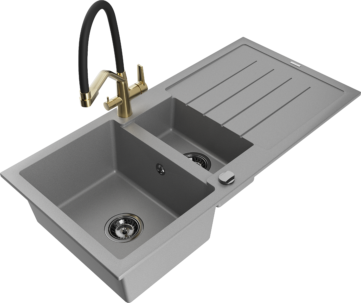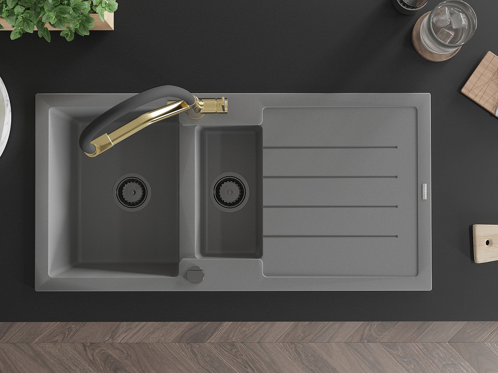 Mexen Andres chiuvetă din granit 1,5 cuve cu scurgător și baterie de bucătărie Duo, gri - 6515-71-671701-57-B