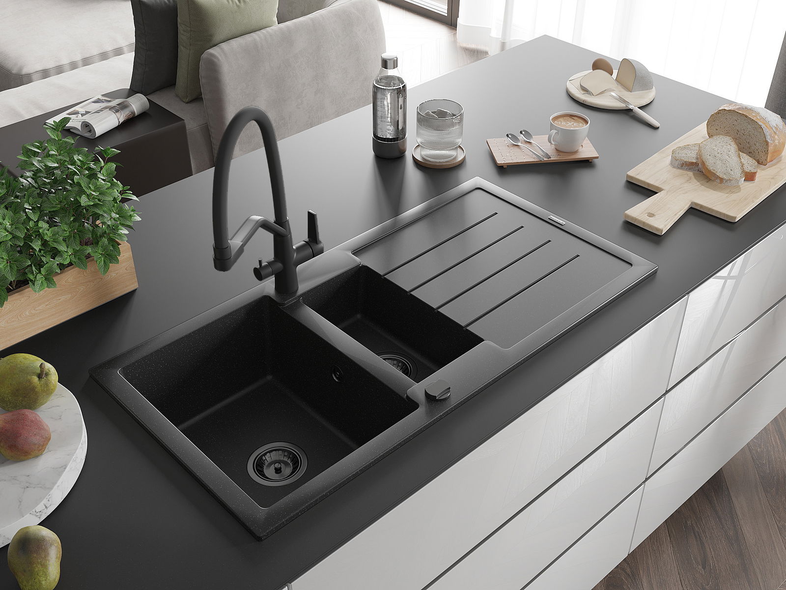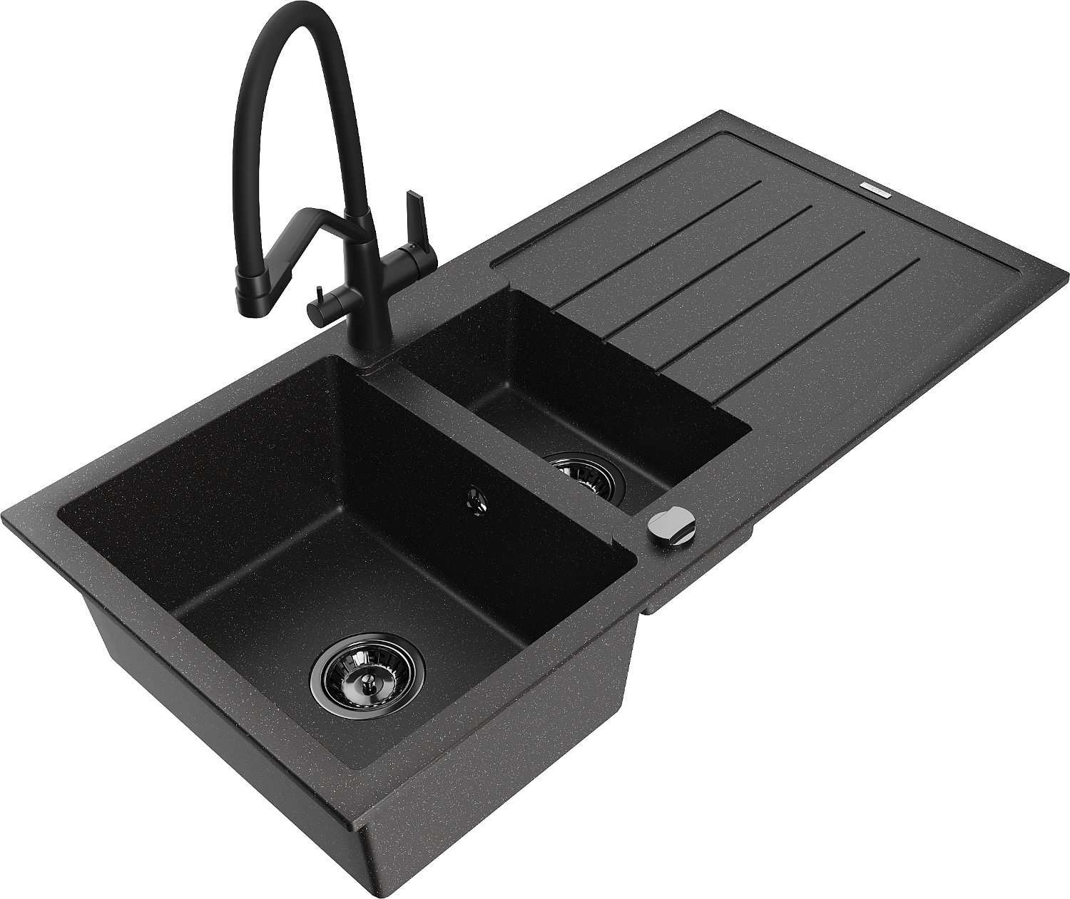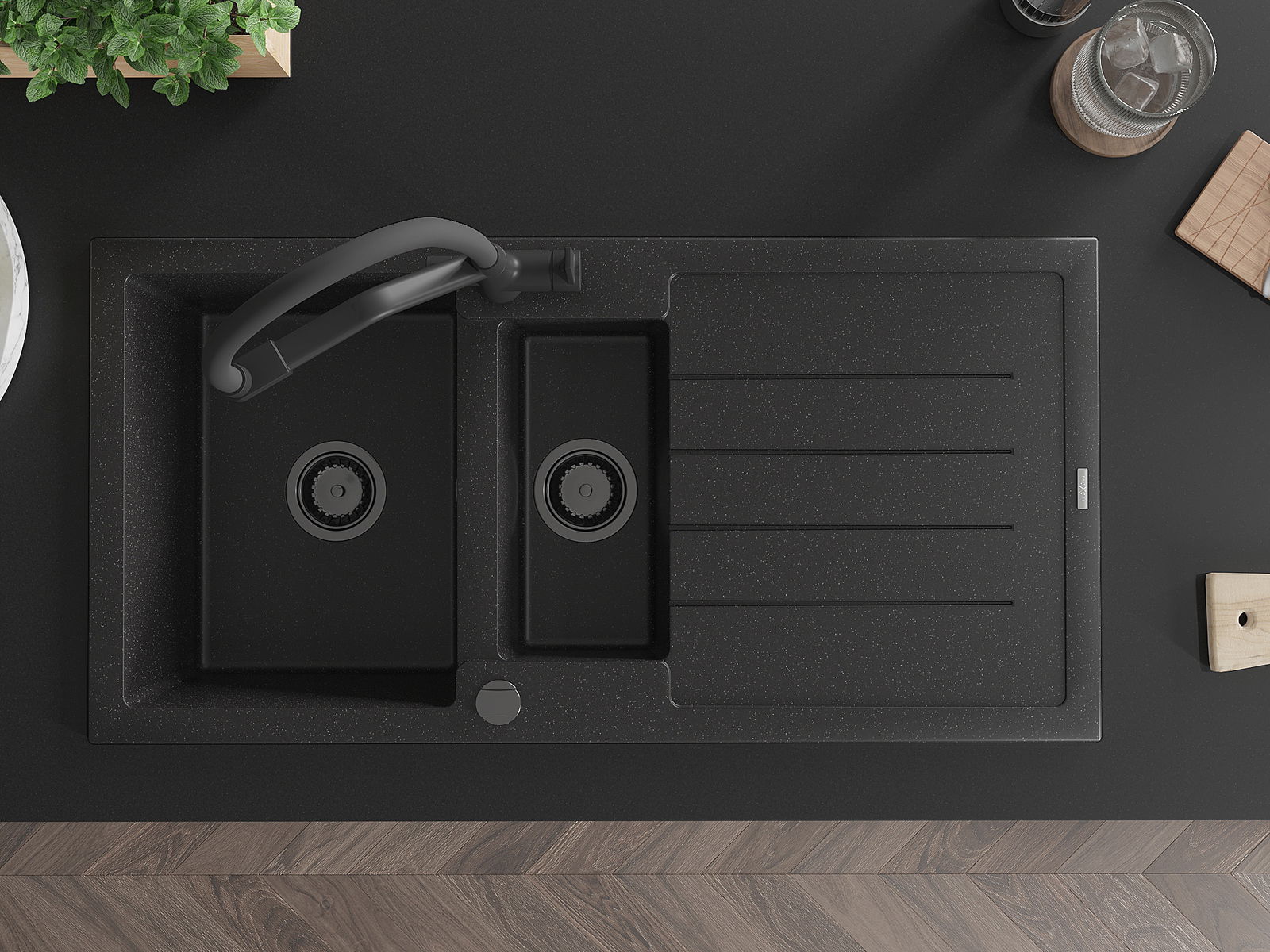 Mexen Andres chiuvetă din granit cu 1,5 cuve și scurgător și robinet de bucătărie Duo, negru/argintiu - 6515-73-671701-70-B