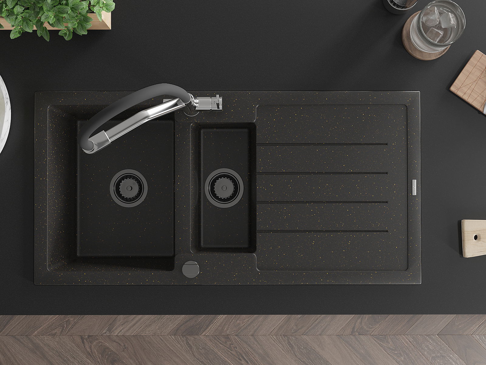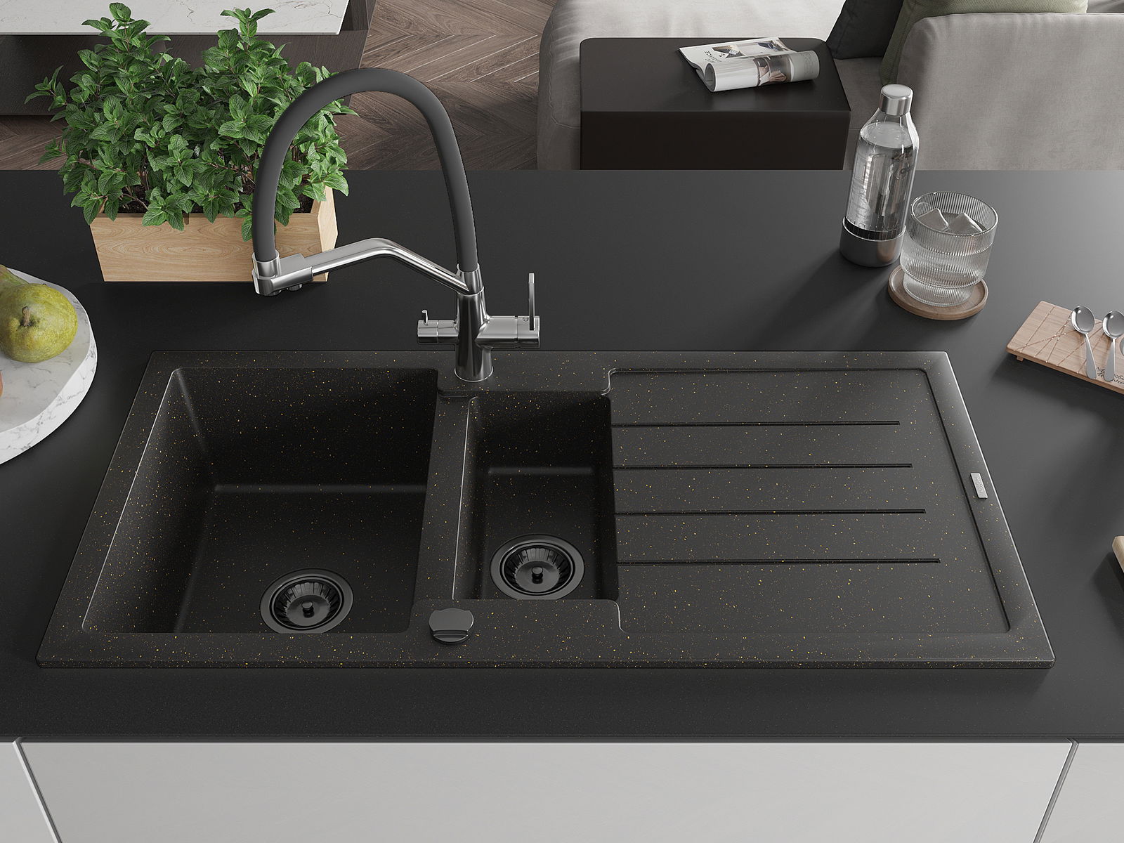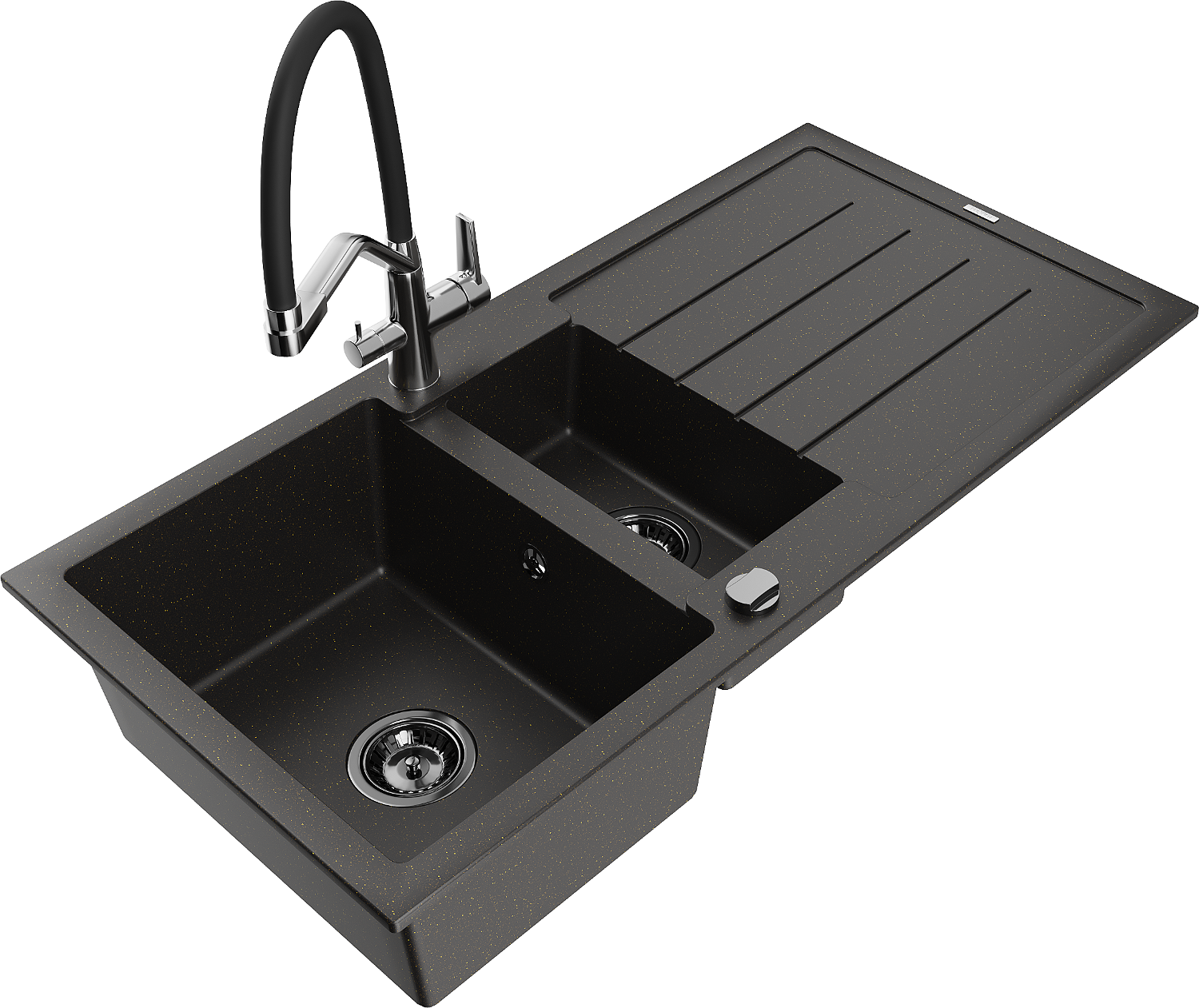Mexen Andres chiuvetă din granit cu 1,5 camere cu scurgător și robinet de bucătărie Duo, negru/auriu metalic
