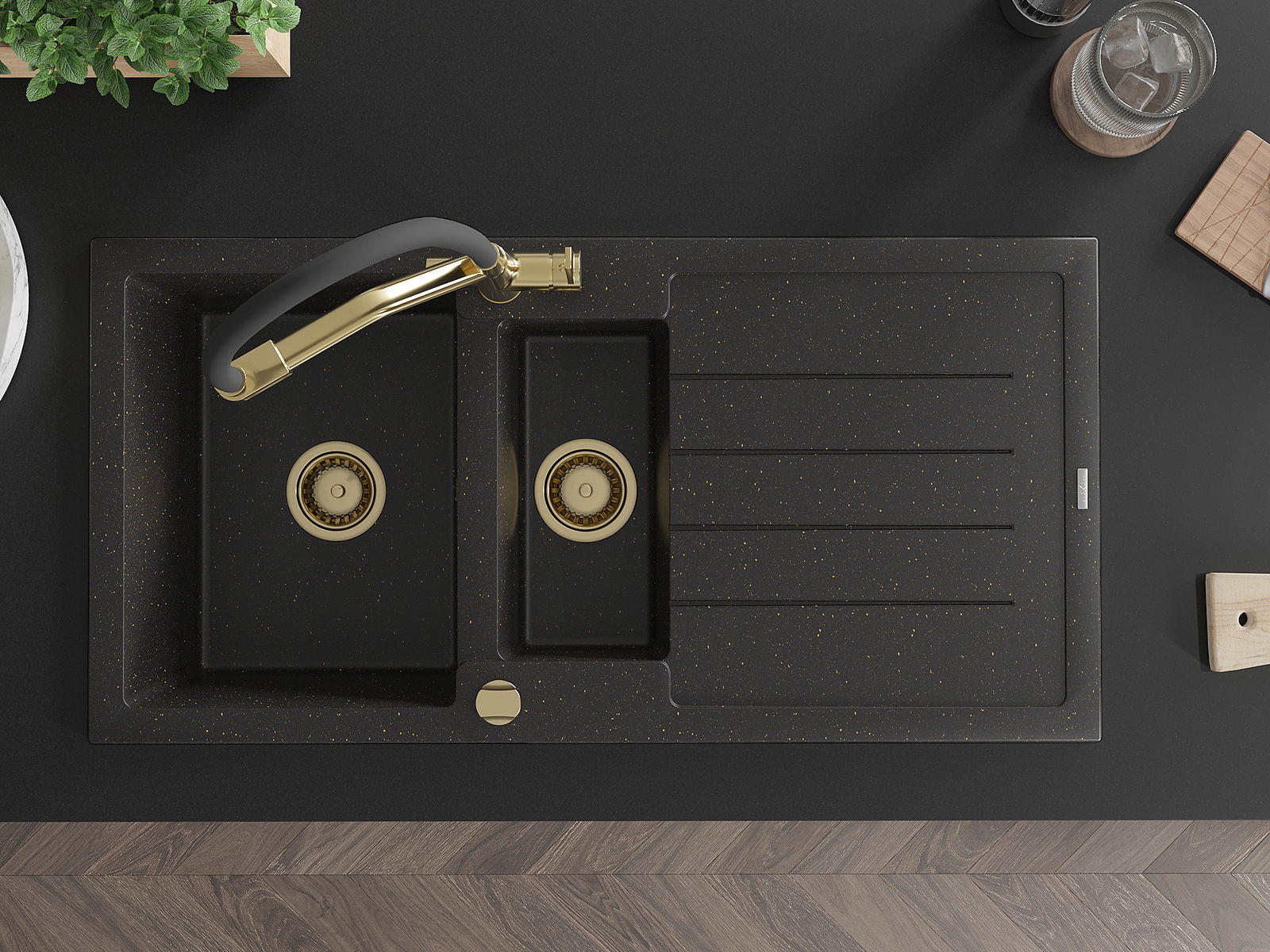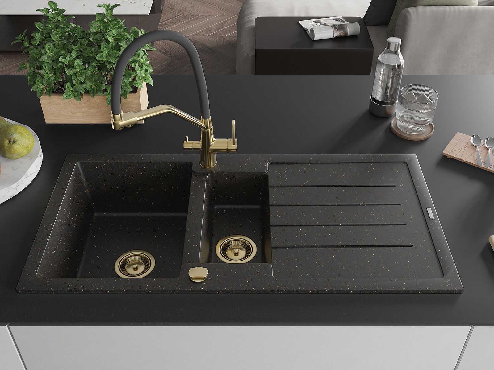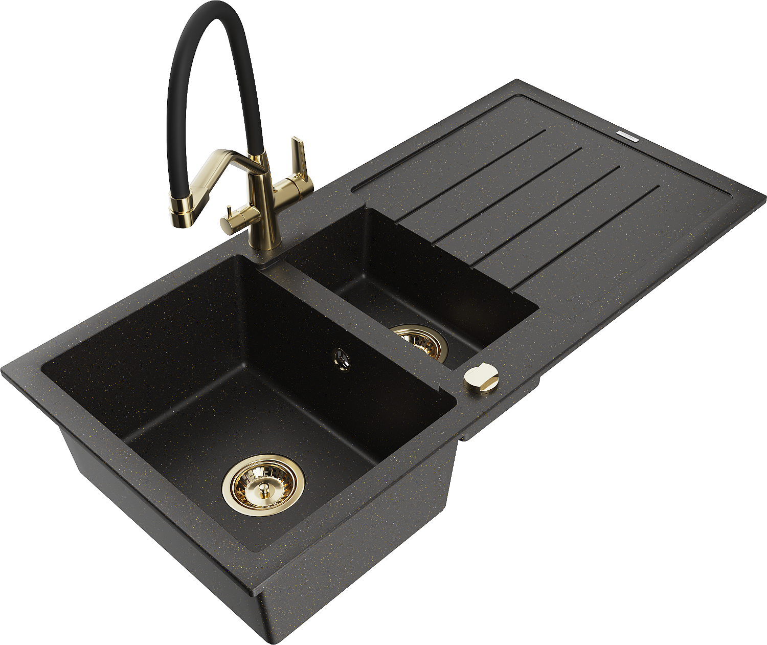 Mexen Andres chiuvetă din granit 1,5 boluri cu picurător și baterie de bucătărie Duo, negru/auriu metalic - 6515-75-671701-57-G