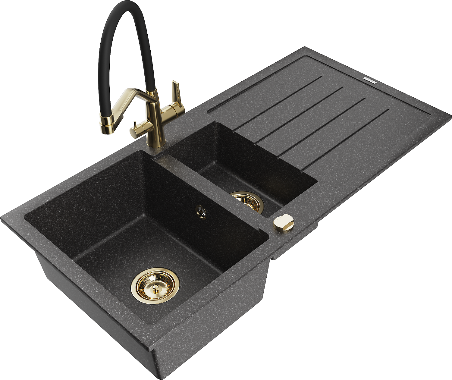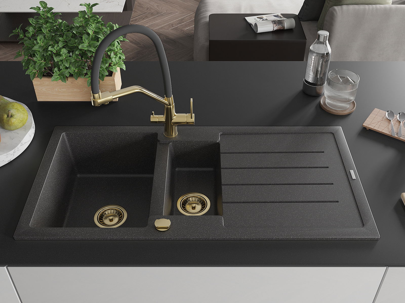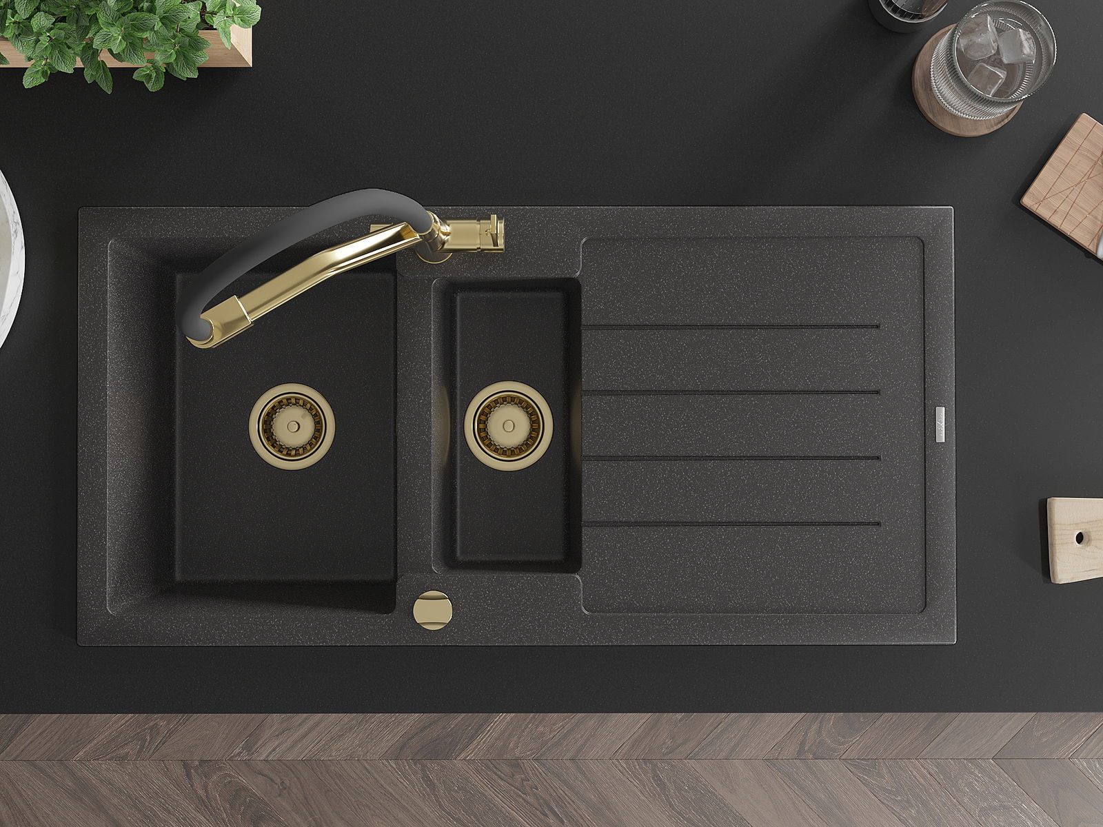 Mexen Andres chiuvetă de granit cu 1,5 cuve cu scurgător și baterie de bucătărie Duo, negru stropit - 6515-76-671701-57-G