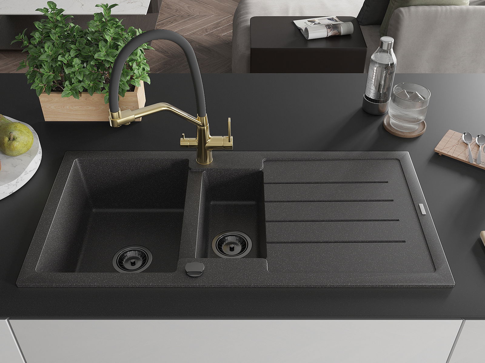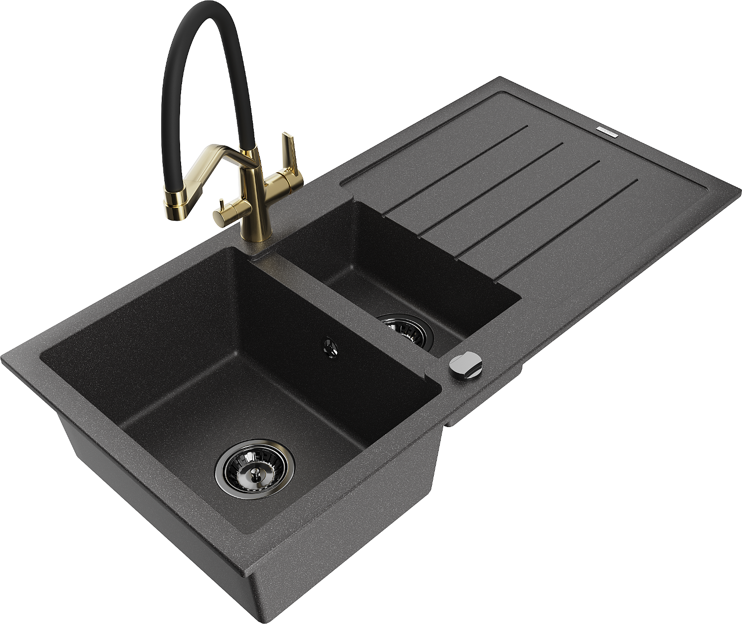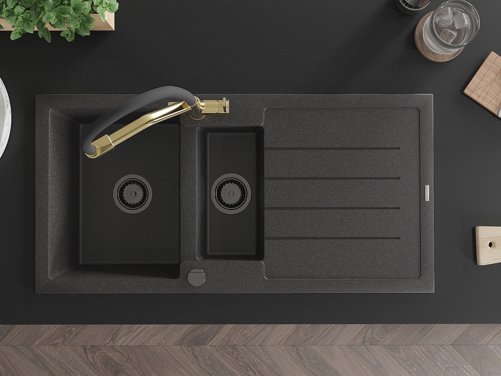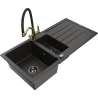 Mexen Andres chiuvetă de bucătărie din granit cu 1,5 compartimente, cu scurgător și baterie Duo, neagră cu pete