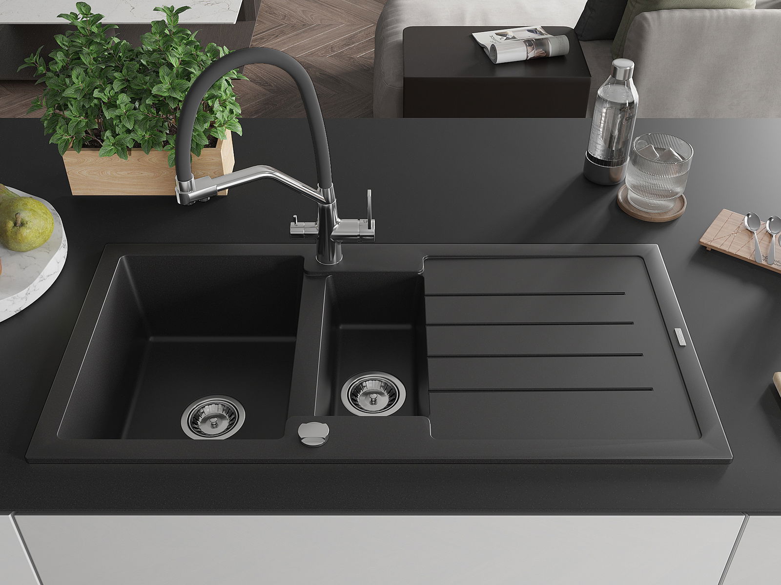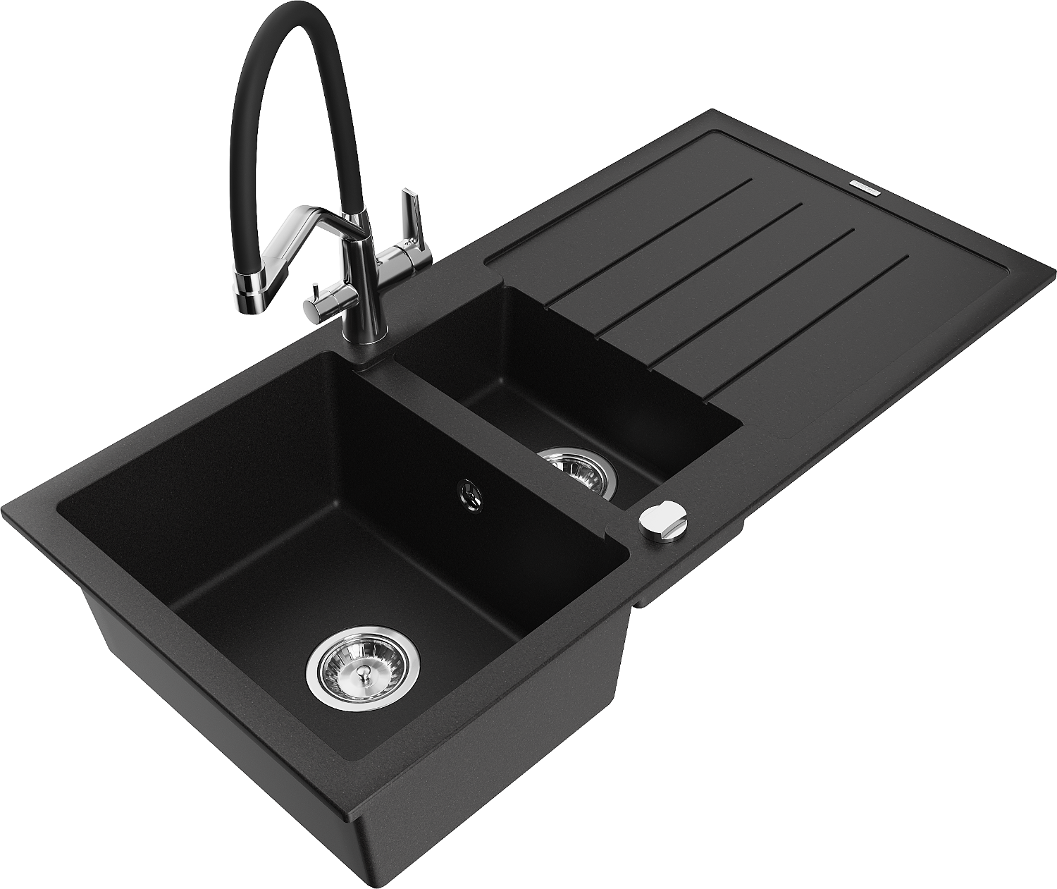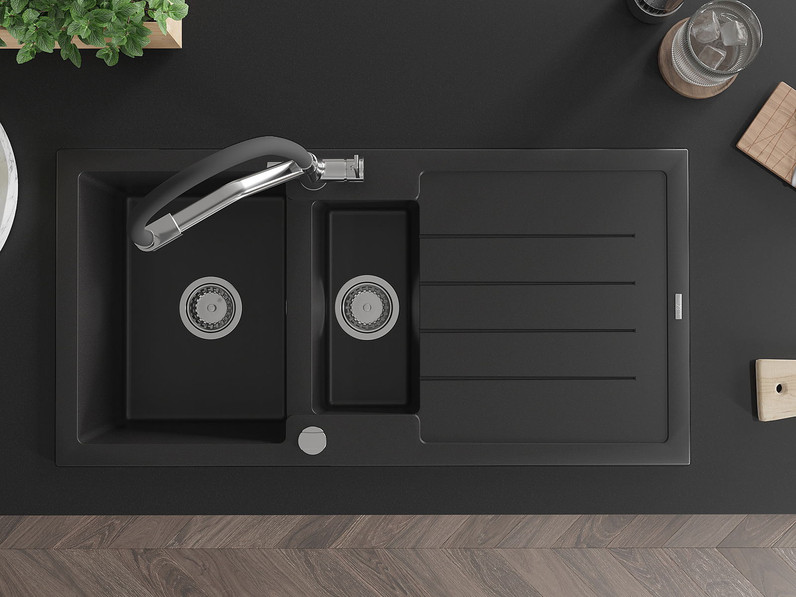 Mexen Andres chiuvetă granit 1,5 compartiment cu scurgător și baterie de bucătărie Duo, negru - 6515-77-671701-07