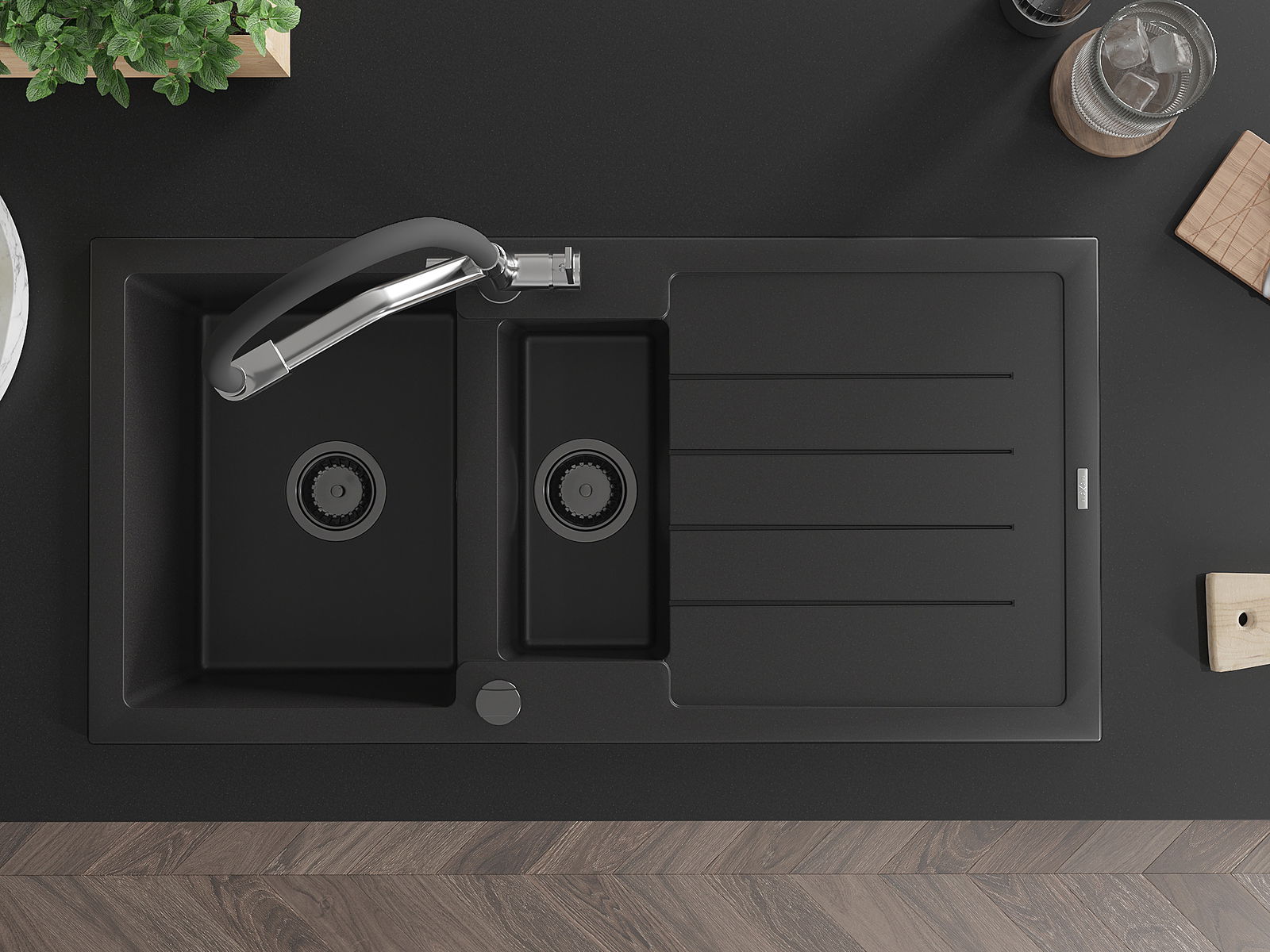 Datorită sistemului de montare universală, chiuveta este reversibilă, iar scurgerea poate fi montată pe blat la stânga sau la dreapta. În acest fel, puteți ajusta cu ușurință pagina la nevoile și condițiile dvs.