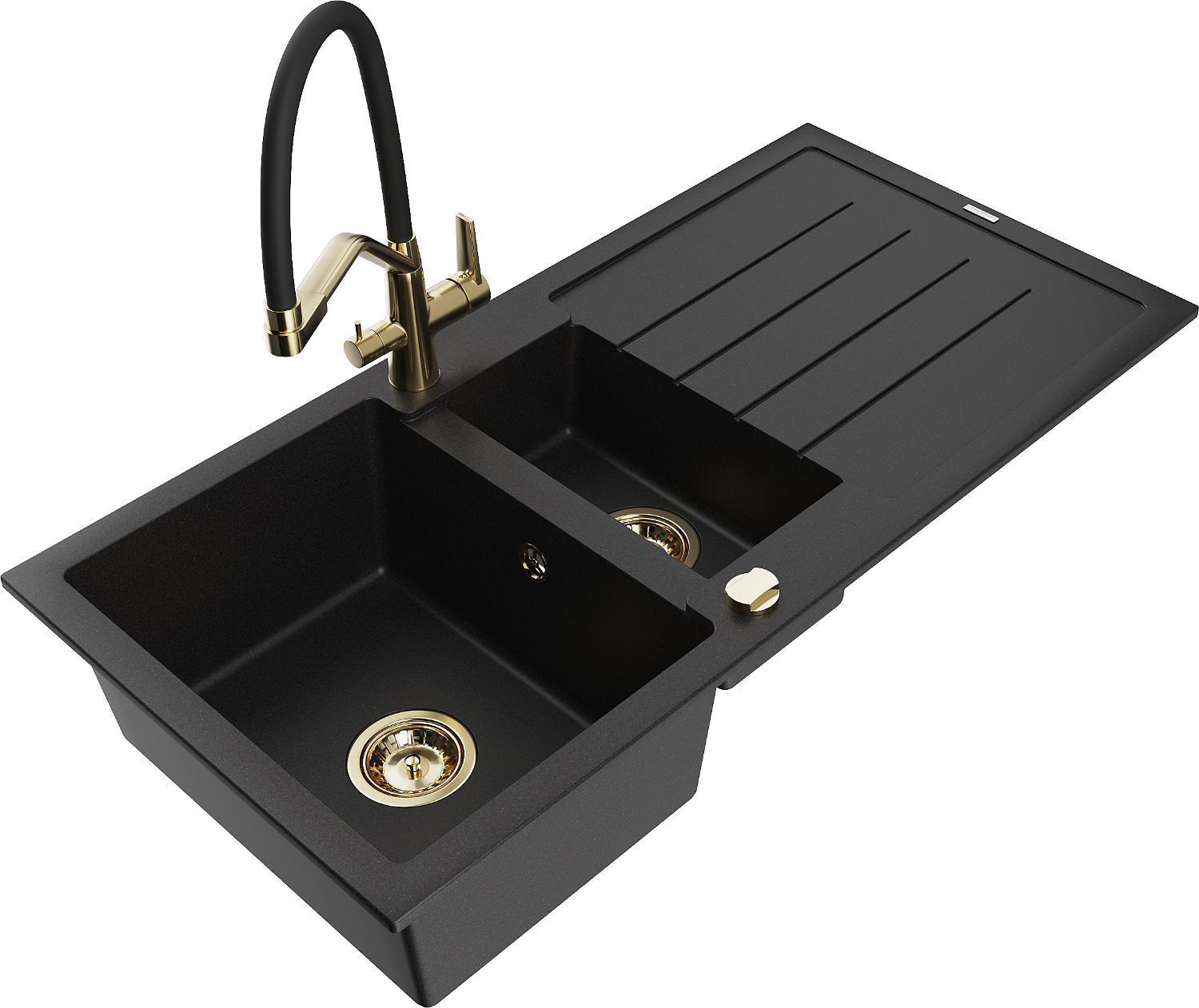 Mexen Andres chiuvetă de granit cu 1,5 compartimente și scurgător, cu baterie de bucătărie Duo, negru - 6515-77-671701-57-G