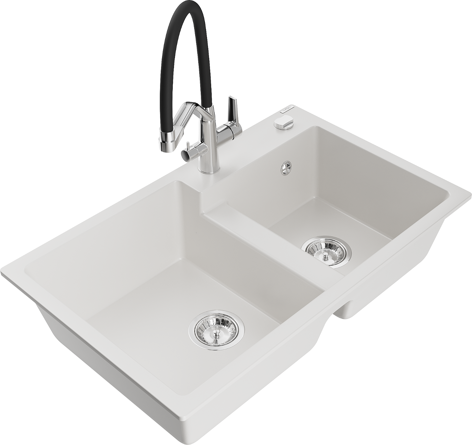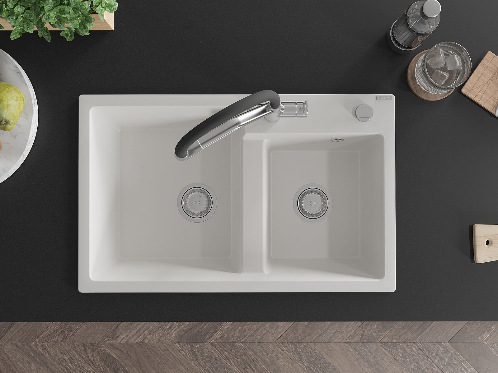 Mexen Tomas chiuvetă de bucătărie granit cu 2 compartimente și baterie Duo, alb - 6516-20-671701-07