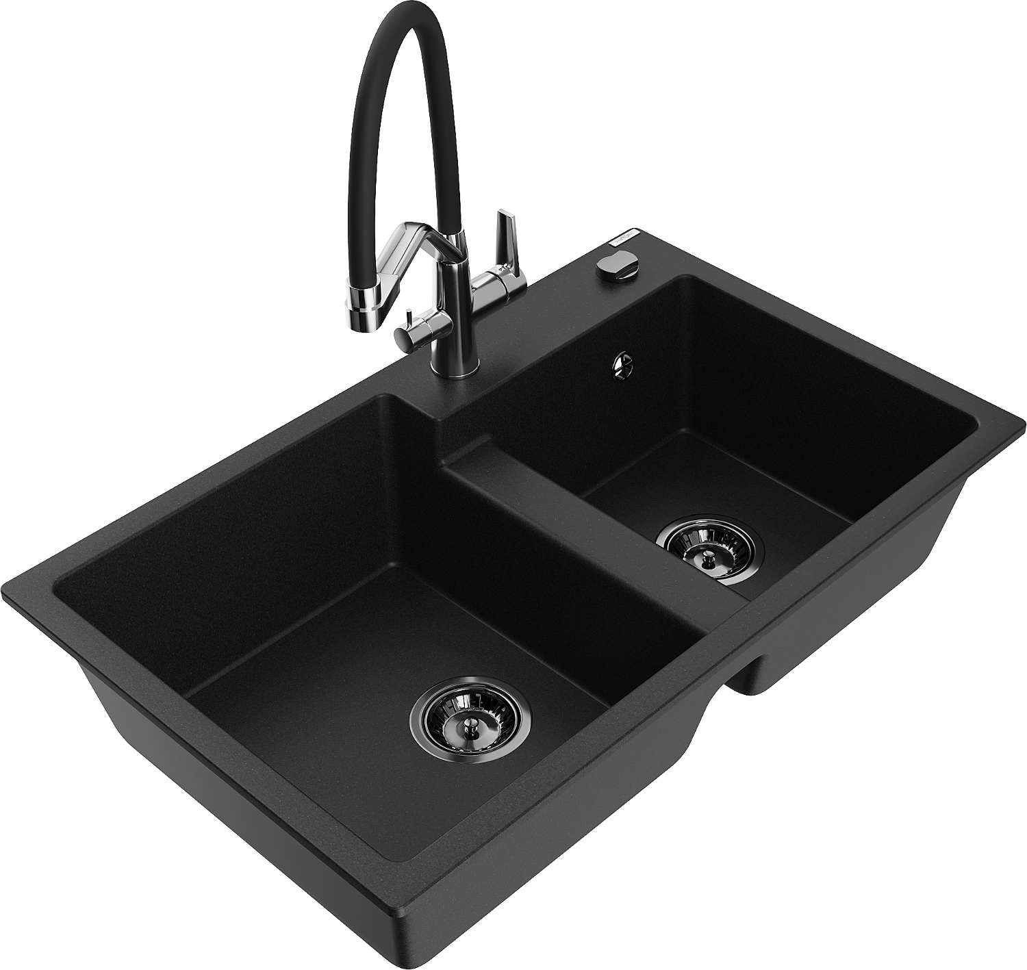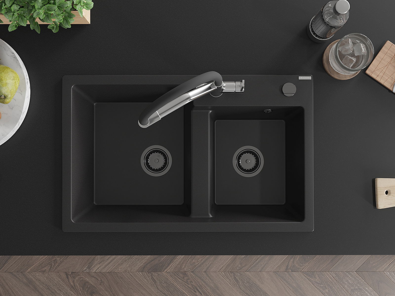 Mexen Tomas chiuvetă de bucătărie din granit cu 2 compartimente și baterie Duo, neagră - 6516-77-671701-07-B