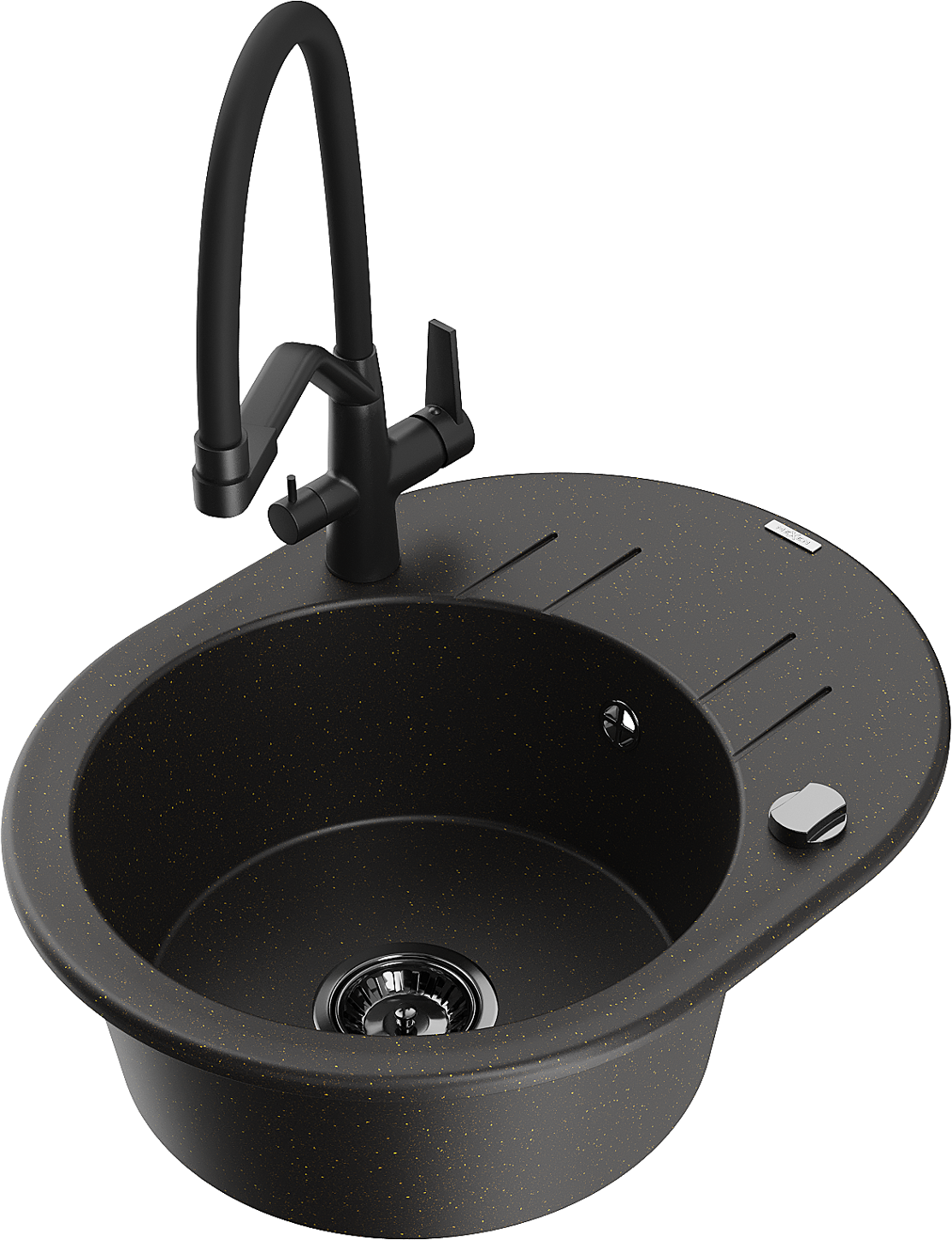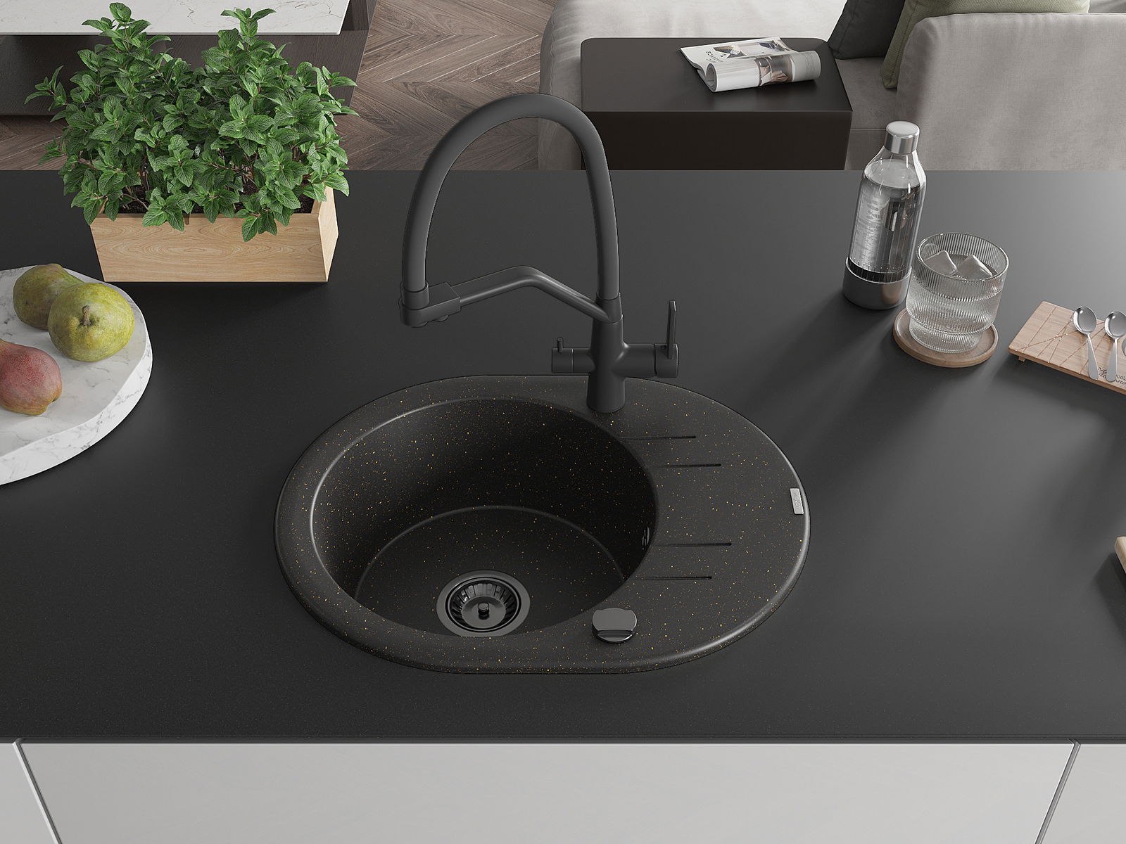 Mexen Kevin chiuvetă de bucătărie din granit cu 1 compartiment și baterie Duo, negru/auriu metalic - 6517-75-671701-70-B
