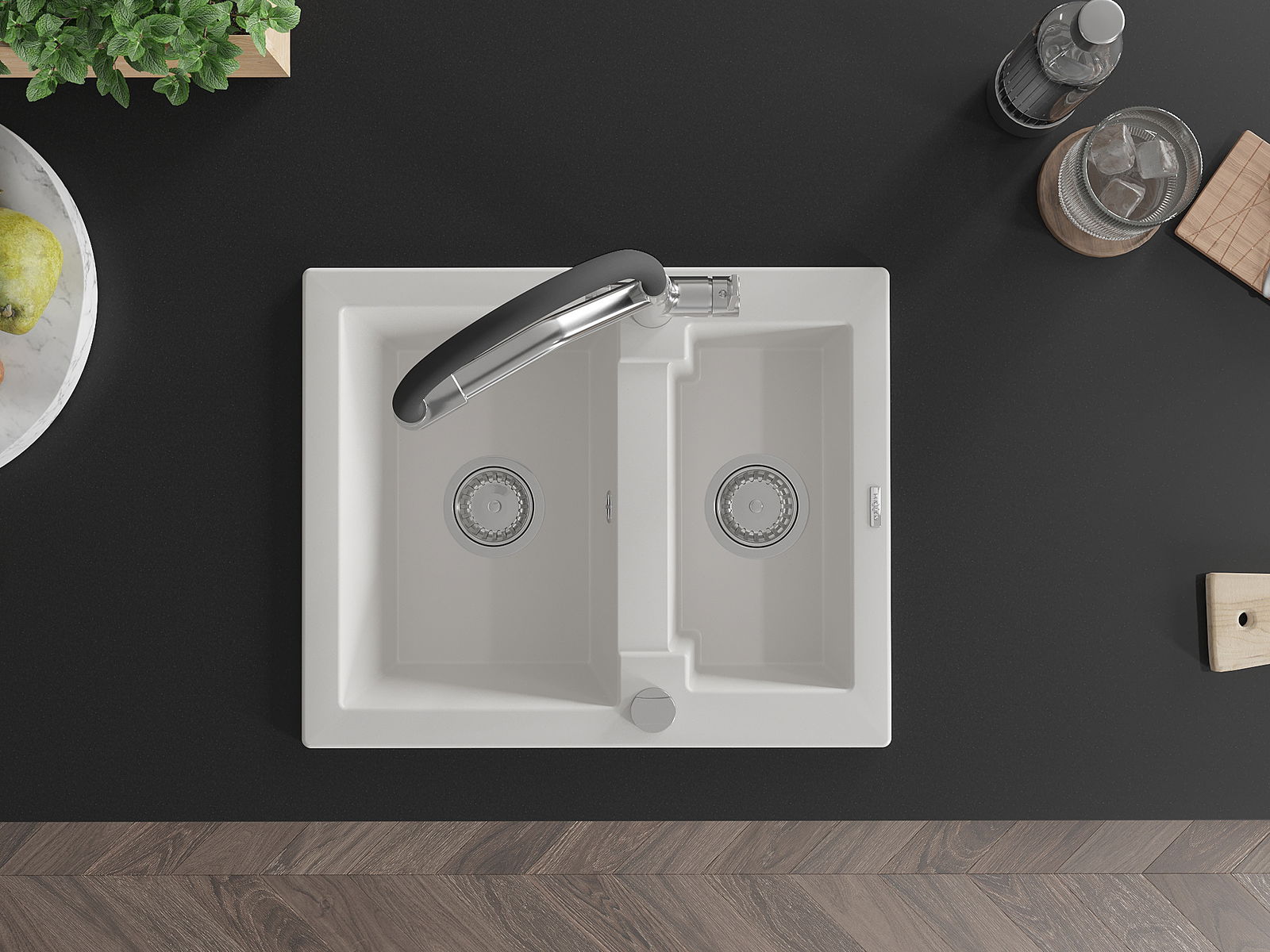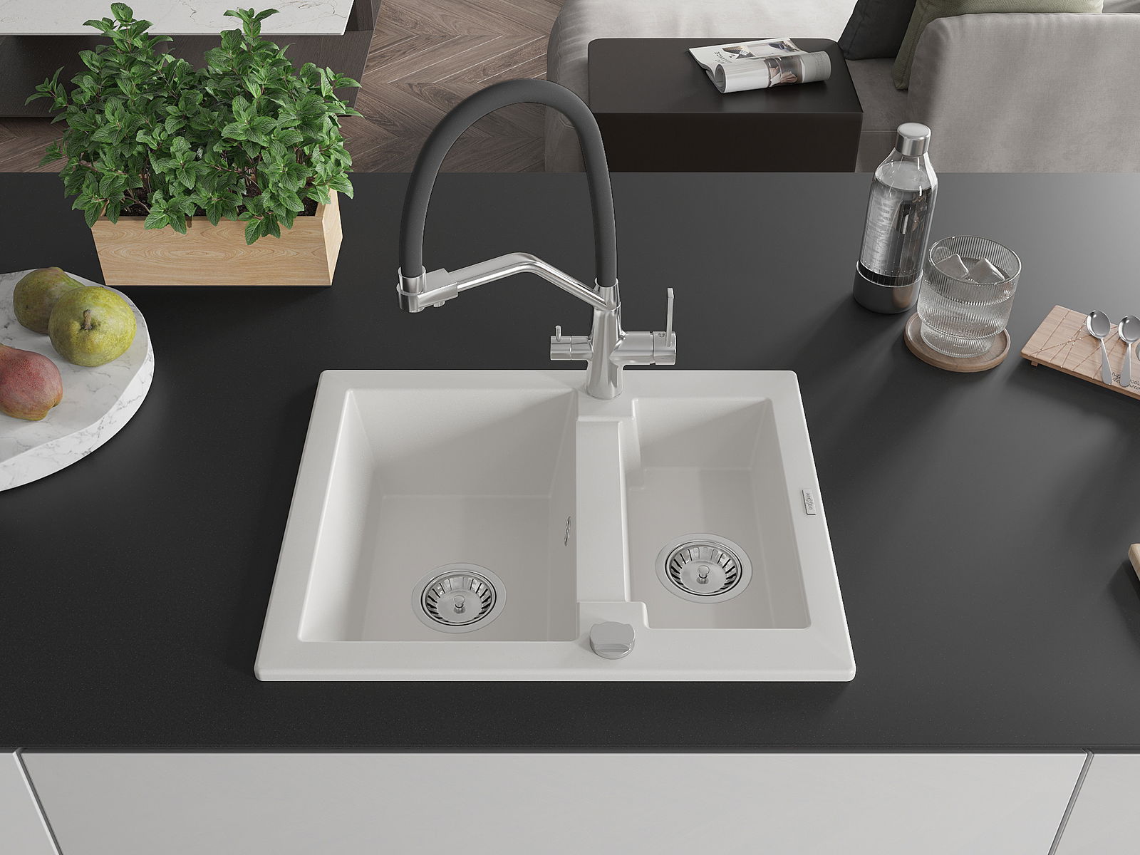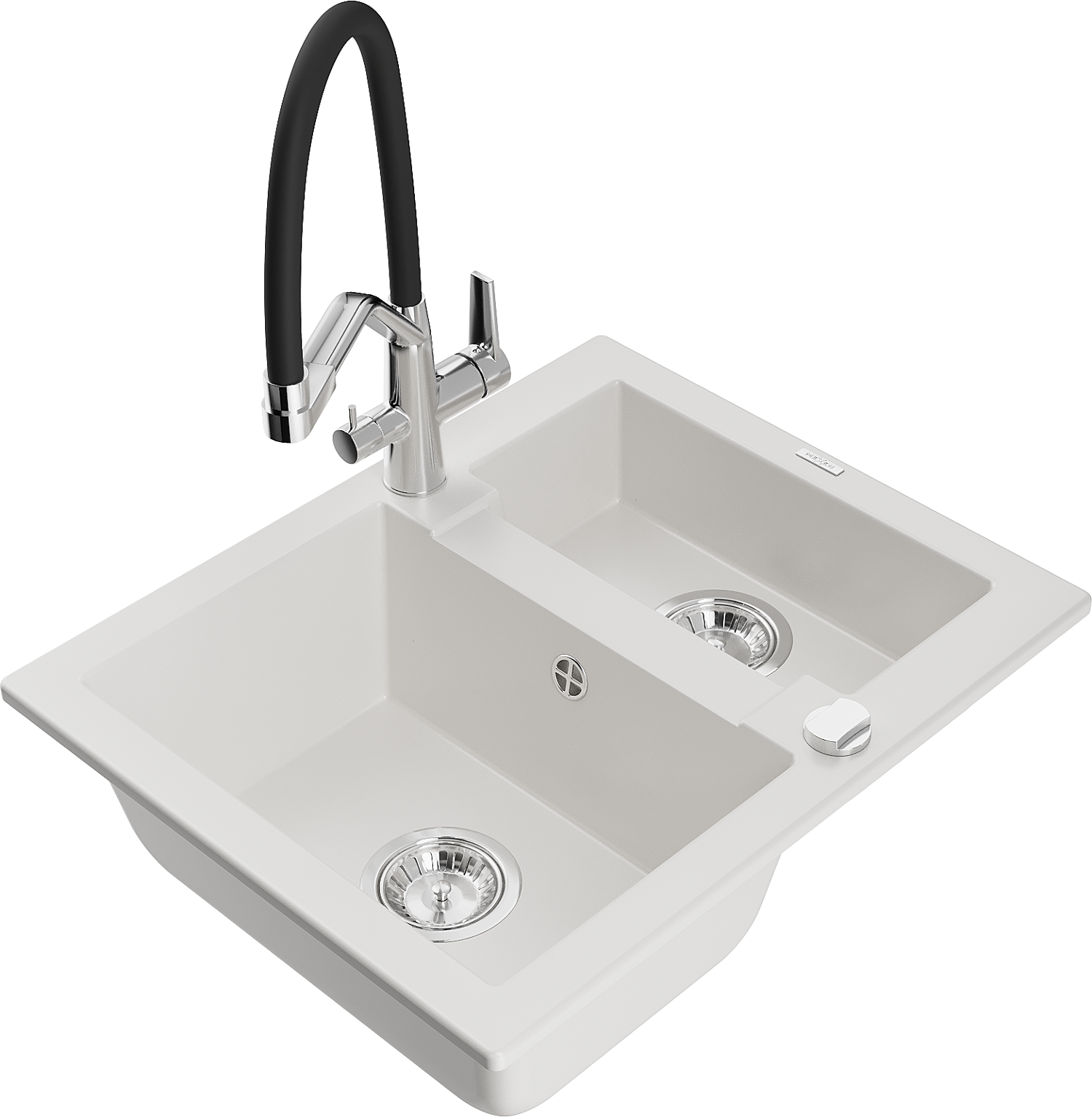 Mexen Carlos chiuvetă de bucătărie din granit cu 1,5 boluri și robinet Duo, alb - 6518-20-671701-07