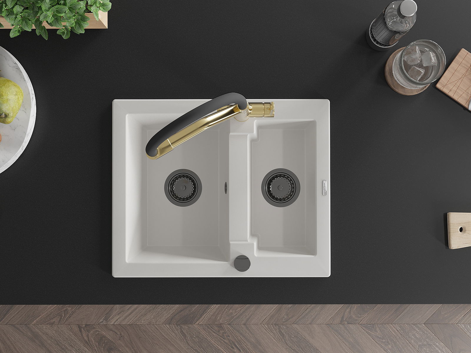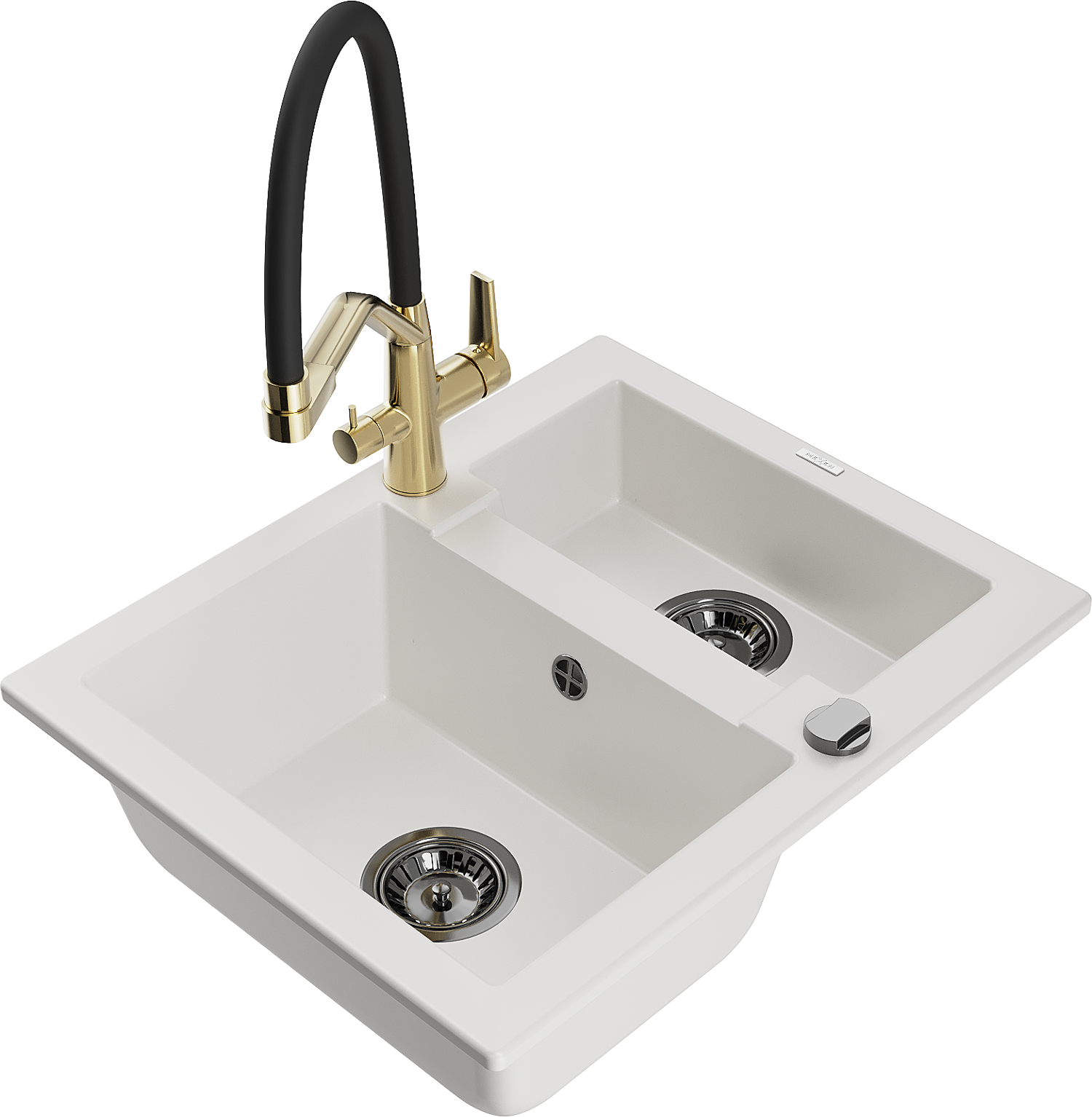 Mexen Carlos chiuvetă de granit cu 1,5 cuve cu baterie de bucătărie Duo, alb - 6518-20-671701-57-B