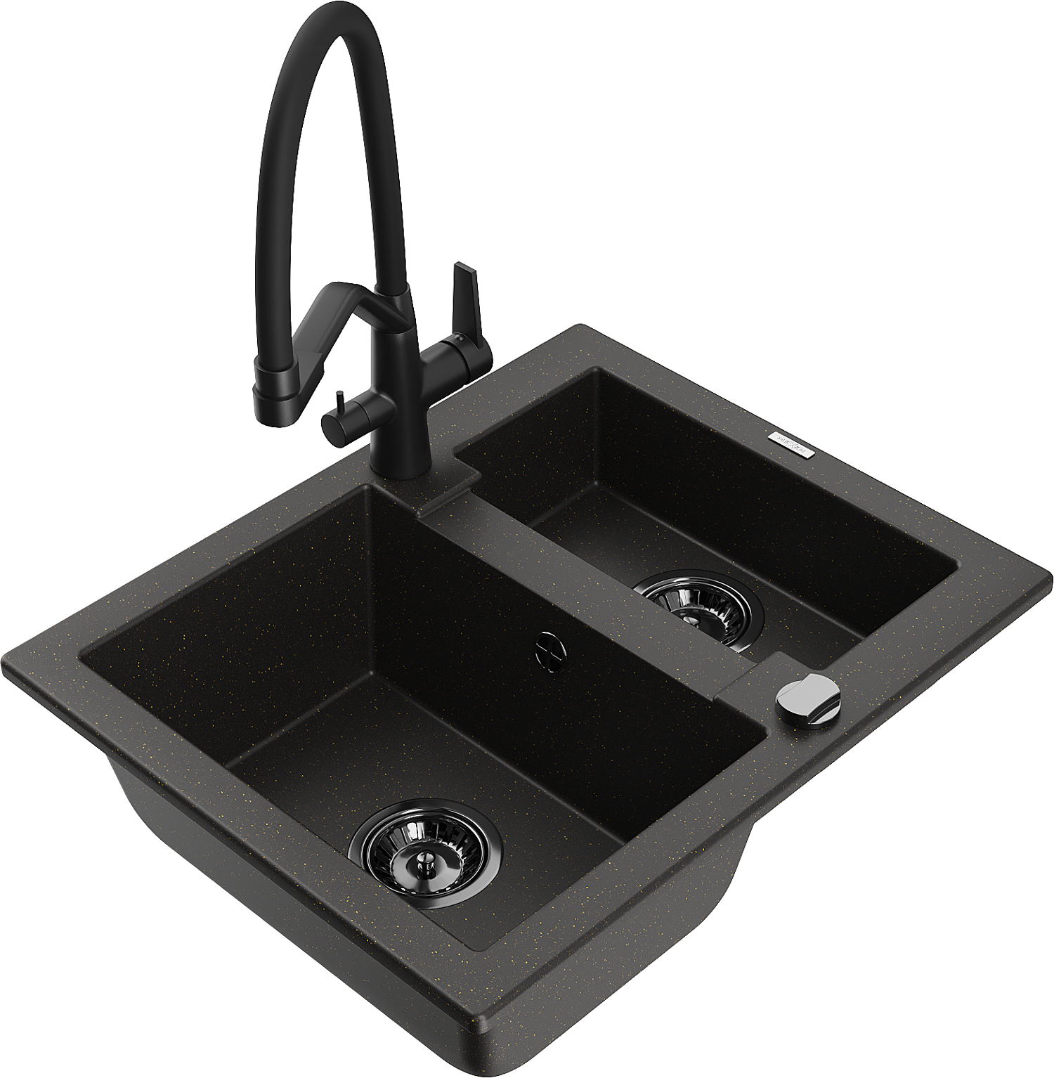 Mexen Carlos chiuvetă de bucătărie din granit cu 1,5 compartimente și baterie Duo, negru/auriu metalizat - 6518-75-671701-70-B