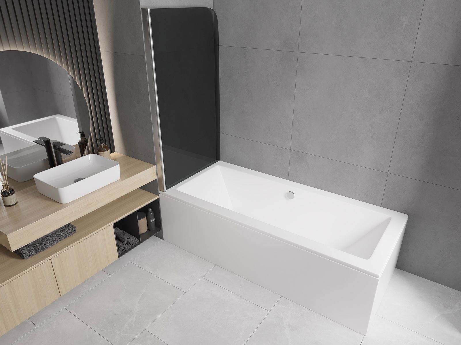 Ecranul are o aripă în mișcare cu posibilitatea de pliere. Această soluție economisește mai mult spațiu în baie și vă permite să utilizați liber spațiul rămas atunci când nu folosim zona de baie.