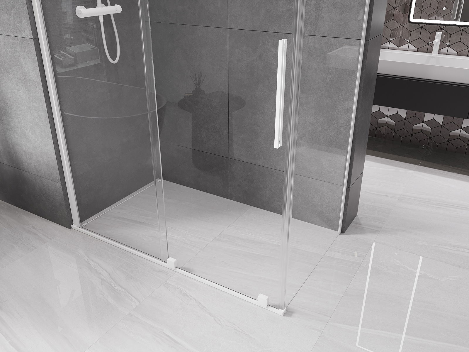 Mânerul practic și confortabil este realizat din oțel inoxidabil. Forma modernă, combinată cu un finisaj asortat cu culoarea profilelor, conferă ansamblului un aspect modern și elegant, subliniind estetica fiecărei băi.