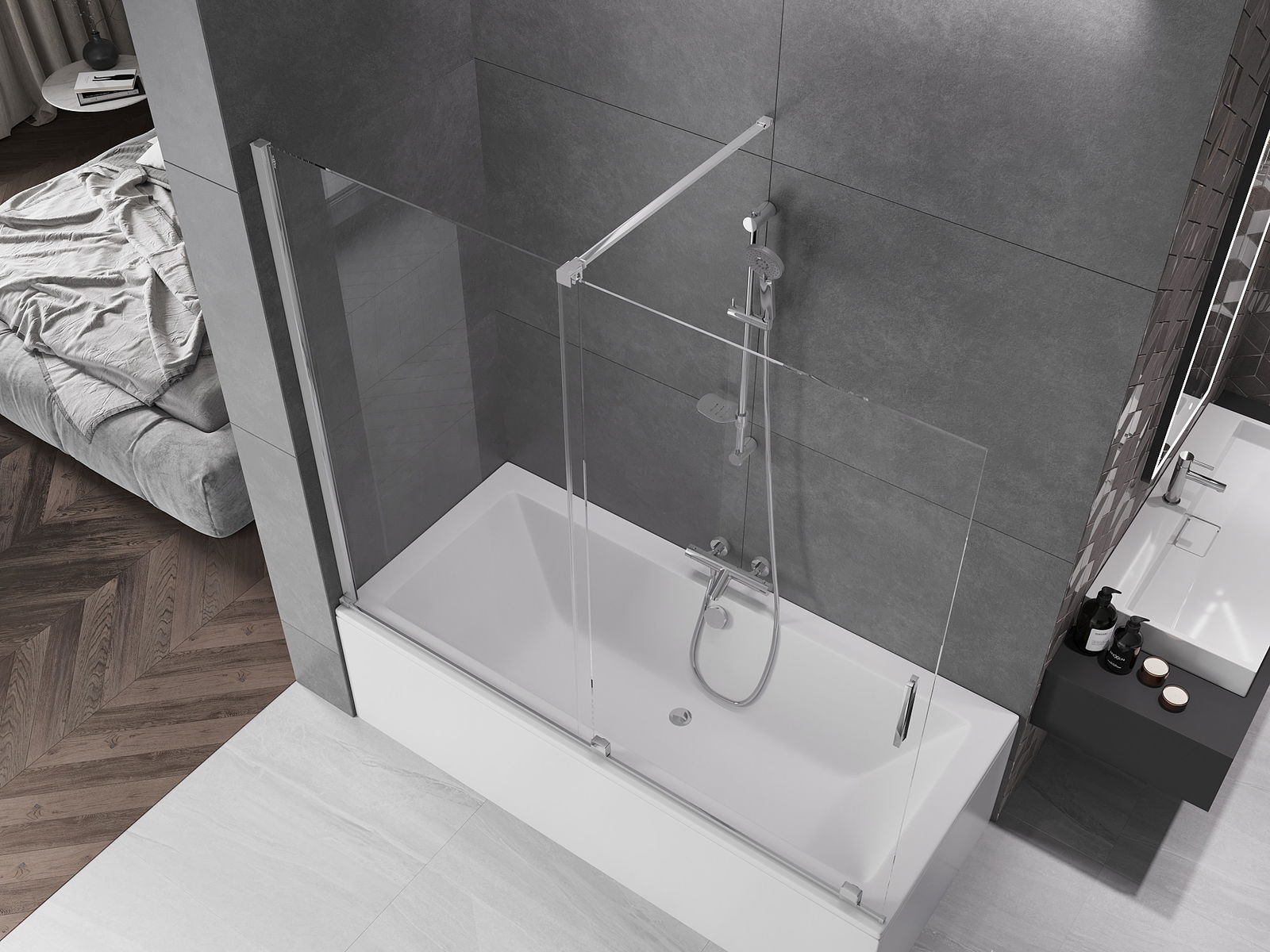 Datorită utilizării unui sistem universal de montare, paravanul poate fi montat pe partea dreaptă sau pe partea stângă, în funcție de necesități. În acest fel, poți proiecta cu ușurință un duș adaptat la spațiul băii.