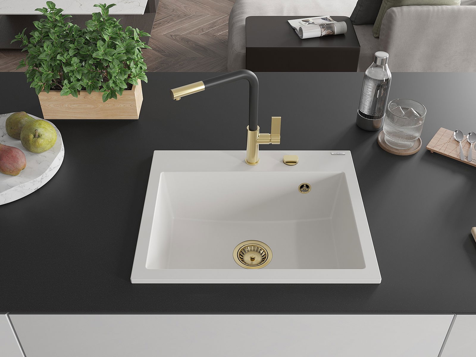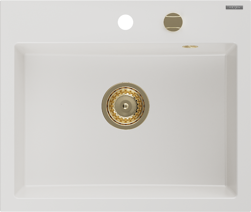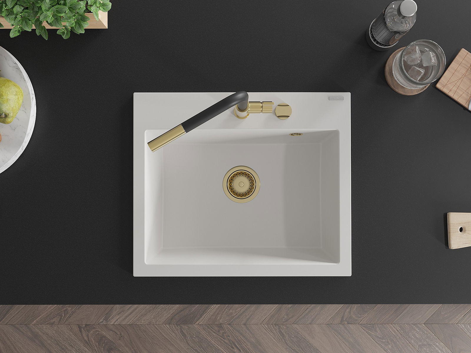 Mexen Oscar chiuvetă din granit cu 1 compartiment 580 x 490 mm, alb, sifon auriu - 6519581000-20-G