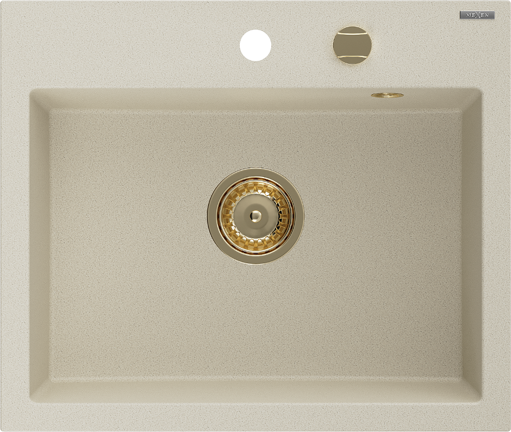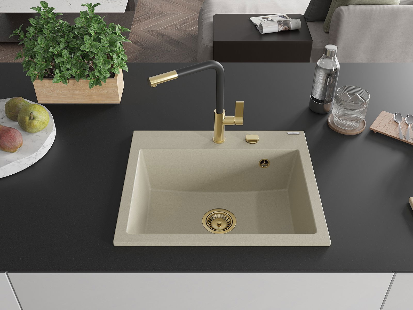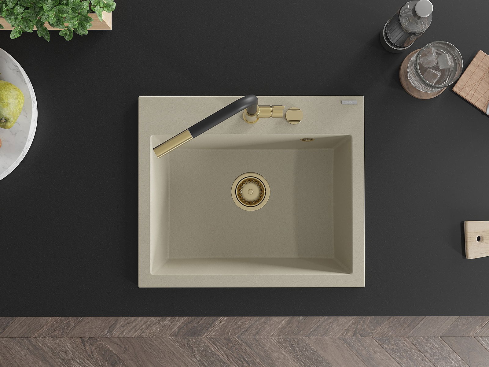 Chiuvetă de granit Mexen Oscar cu 1 compartiment 580 x 490 mm, bej, sifon auriu - 6519581000-69-G