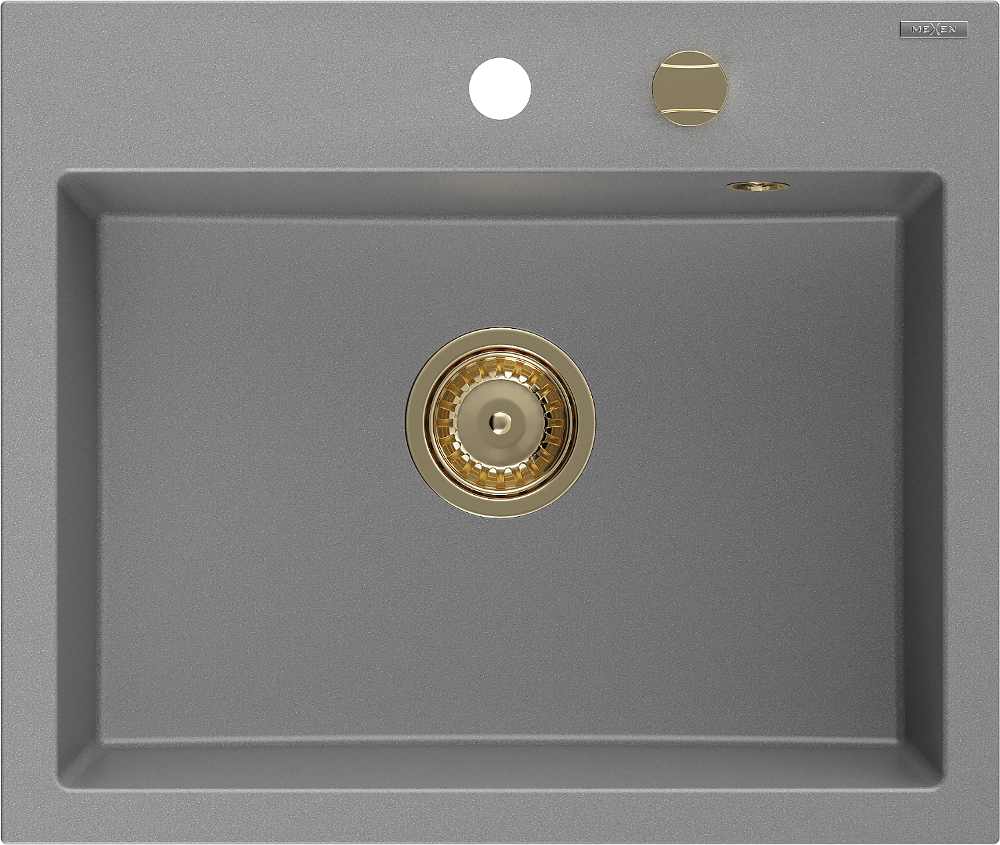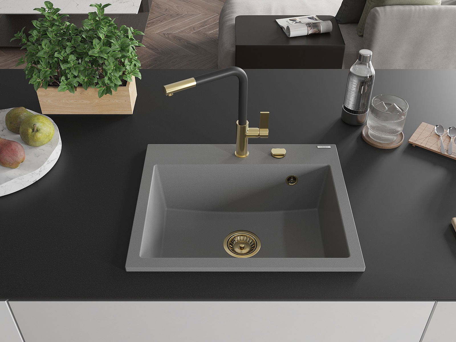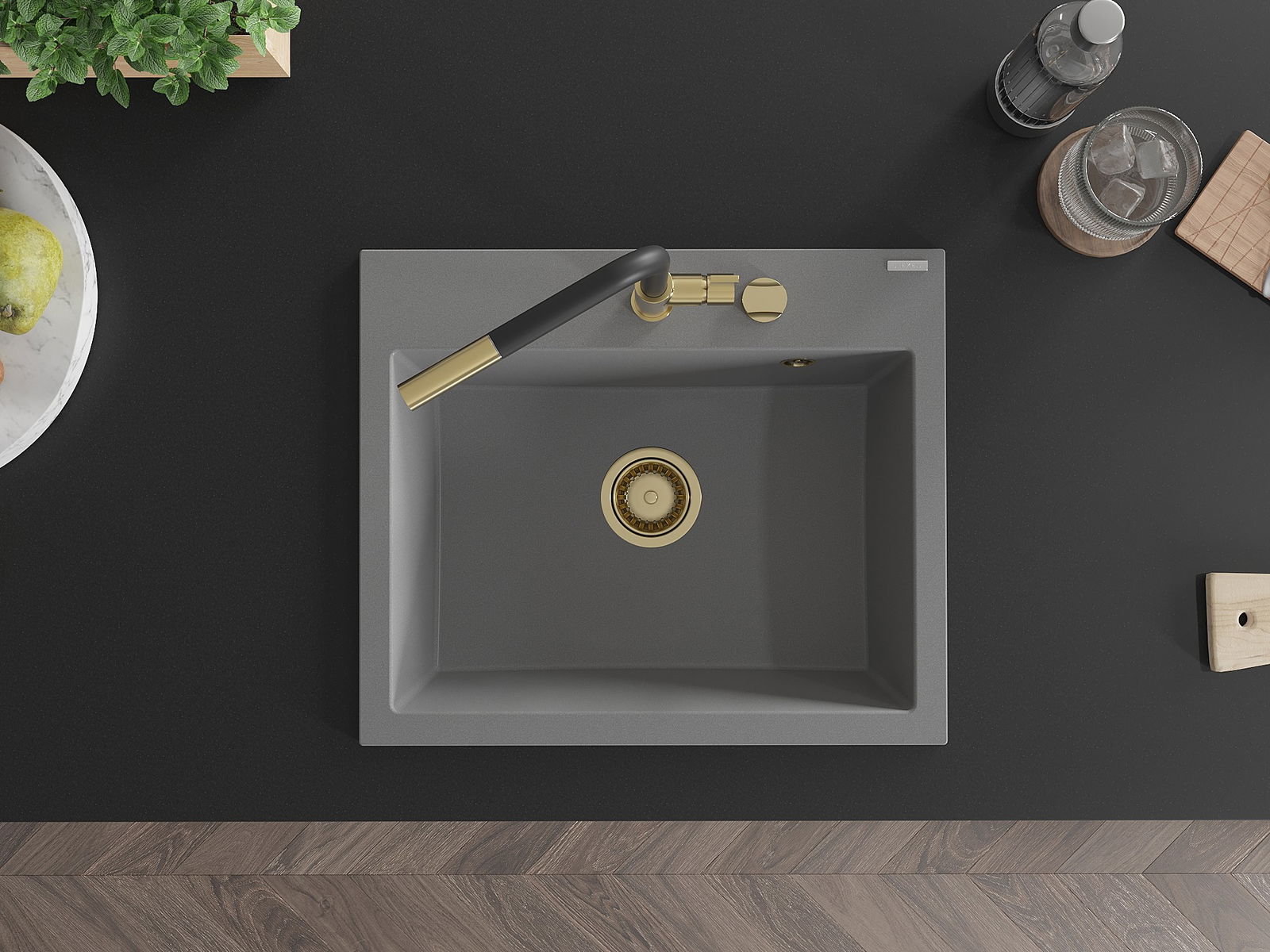 Mexen Oscar chiuvetă de granit cu o singură cuvă 580 x 490 mm, gri, sifon auriu - 6519581000-71-G