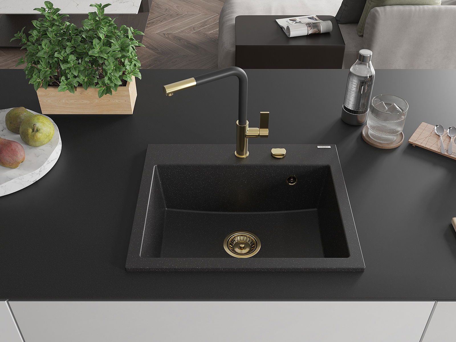 Mexen Oscar chiuvetă din granit cu 1 compartiment 580 x 490 mm, negru/argintiu metalic, sifon auriu - 6519581000-73-G