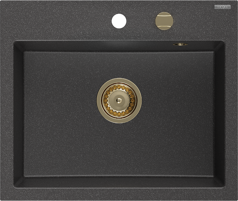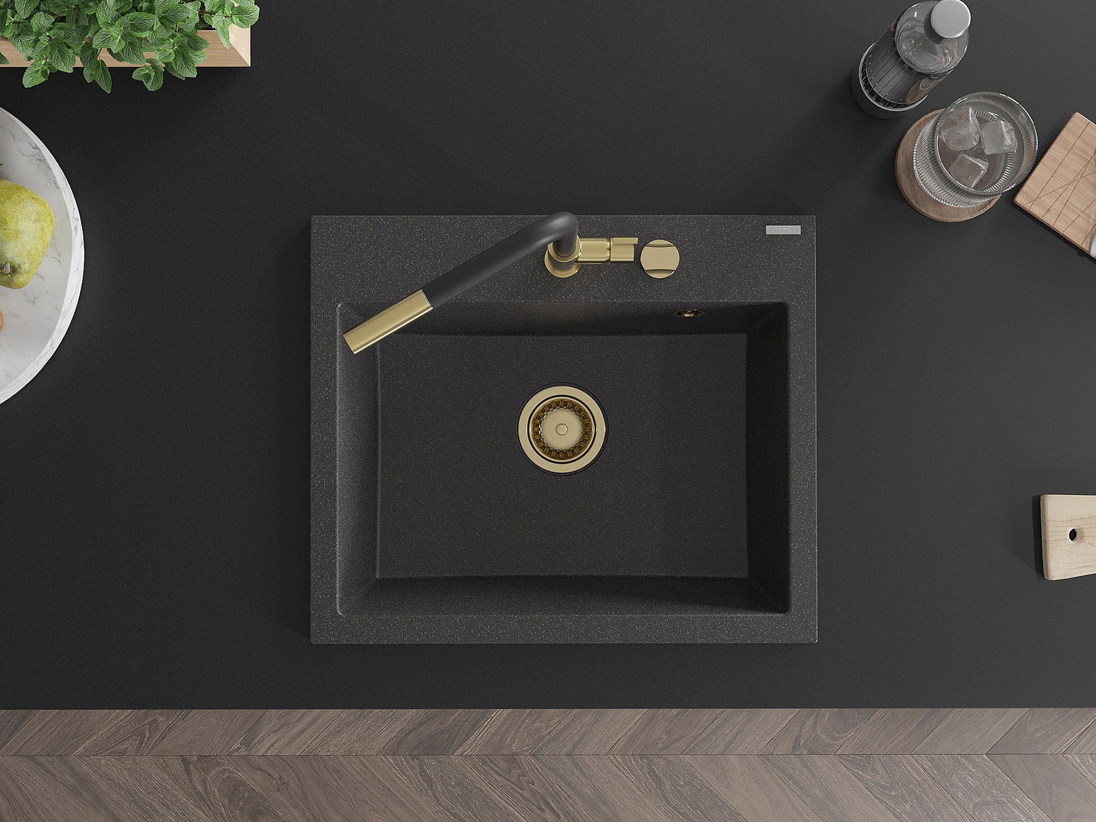Mexen Oscar chiuvetă din granit cu 1 compartiment, 580 x 490 mm, negru pătat, sifon auriu - 6519581000-76-G