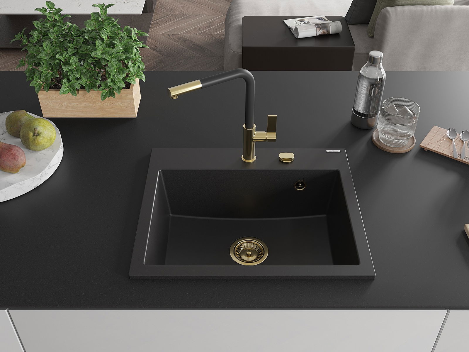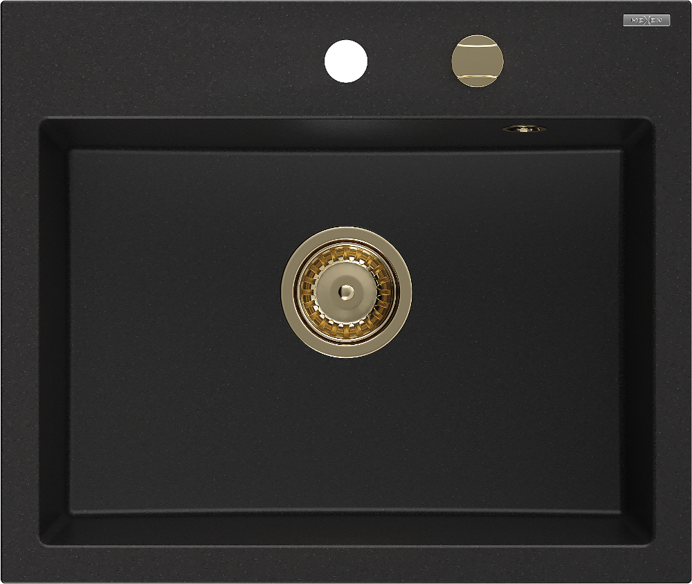 Mexen Oscar chiuvetă de granit cu o cuvă 580 x 490 mm, negru, sifon auriu - 6519581000-77-G