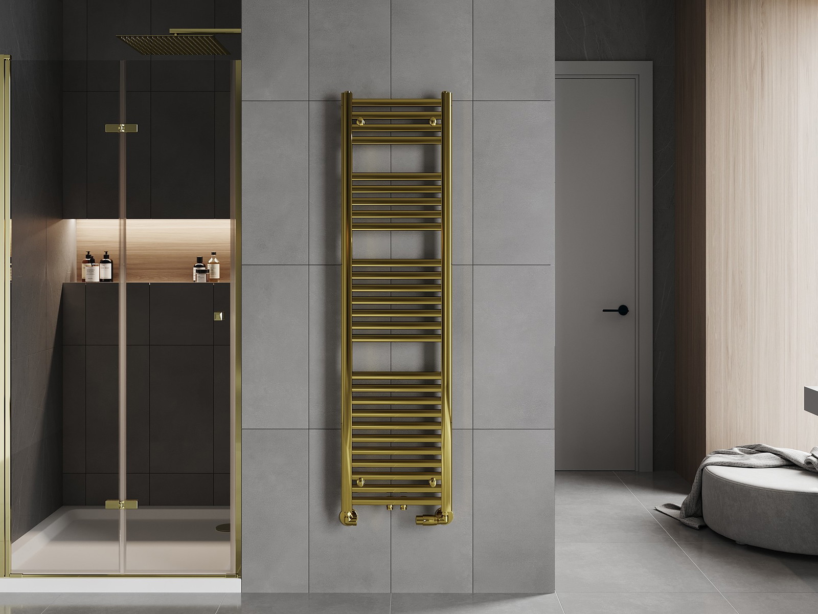 Mexen Hades este un radiator de baie elegant de culoare aurie, care combină perfect funcționalitatea cu stilul. Dimensiunile sale sunt de 1500x400 mm, iar puterea de încălzire este de 461 W la temperaturi de 75/65/20°C. Radiatorul este fabricat din oțel de înaltă calitate, asigurând durabilitate și rezistență la coroziune datorită unui strat special de vopsea. Produsul permite montarea unei rezistențe și oferă flexibilitate în ceea ce privește conectările: jos sau central. Ideal pentru băi moderne, garantând confort termic la o temperatură maximă de lucru de 95°C și o presiune de 0,6 Mpa.