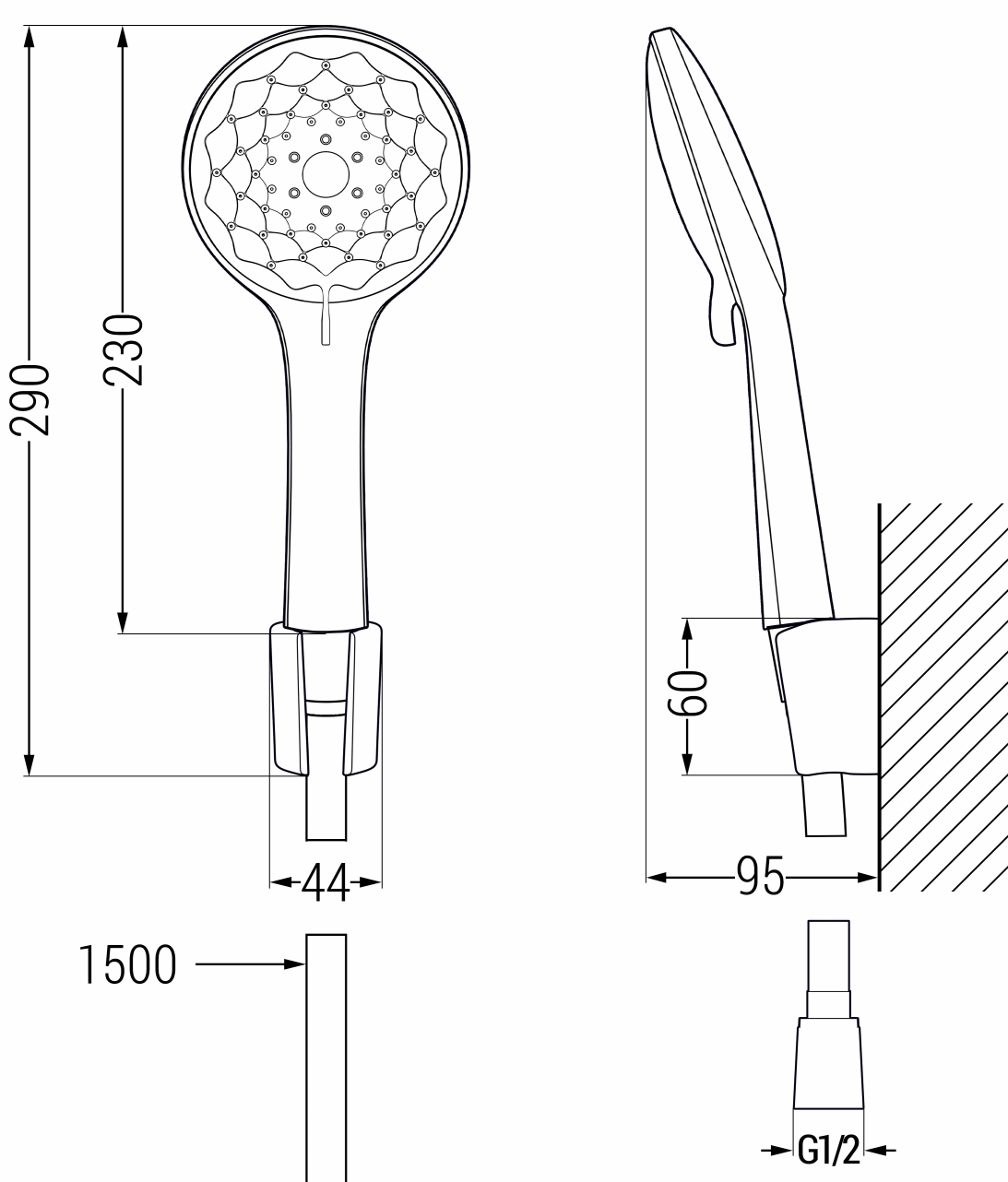 Mânerul de duș are trei tipuri de flux, schimbat cu un comutator. Oferă libertate deplină și capacitatea de a se potrivi cu nevoile utilizatorului, oferind un flux de delicat sau mai puternic și mai concentrat de apă.