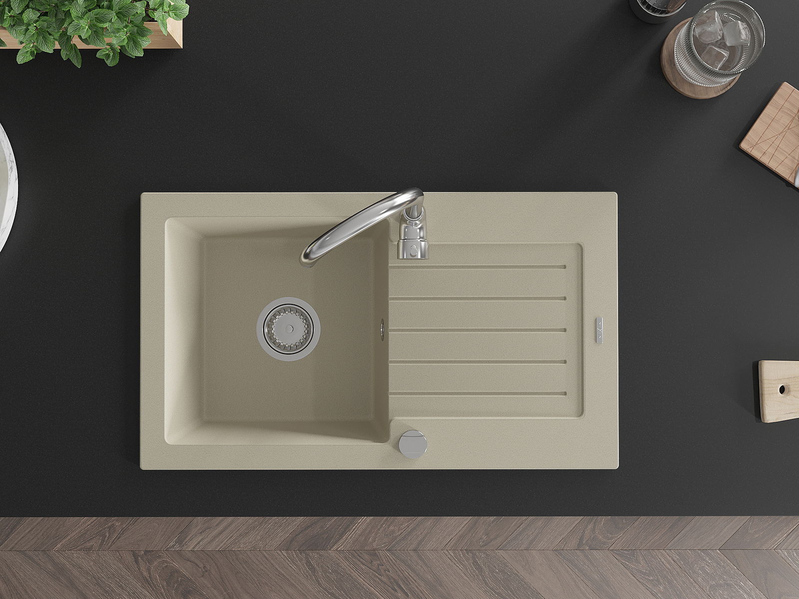 Mexen Pablo chiuvetă din granit cu 1 compartiment și scurgător 752 x 436 mm, bej, sifon crom - 6510751010-69
