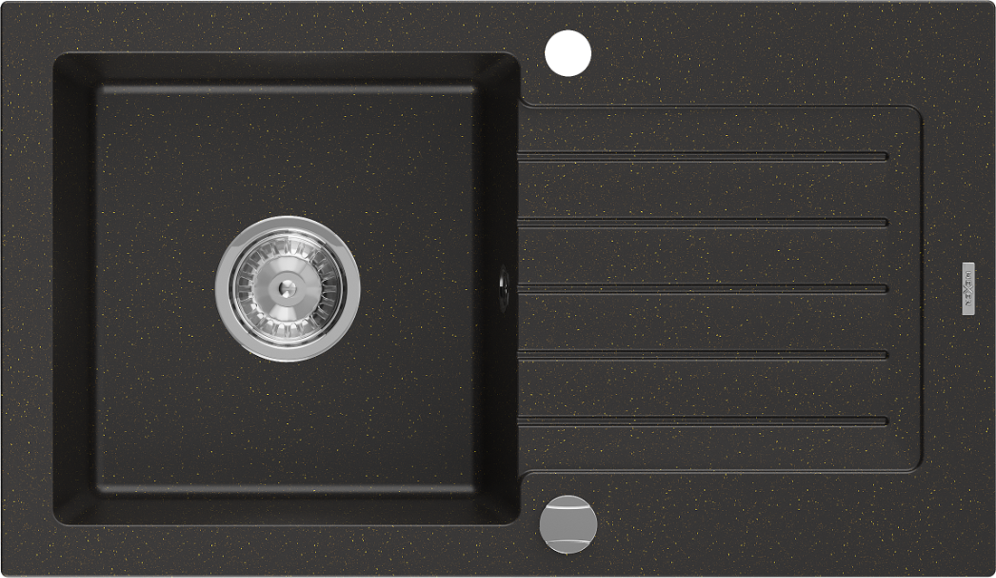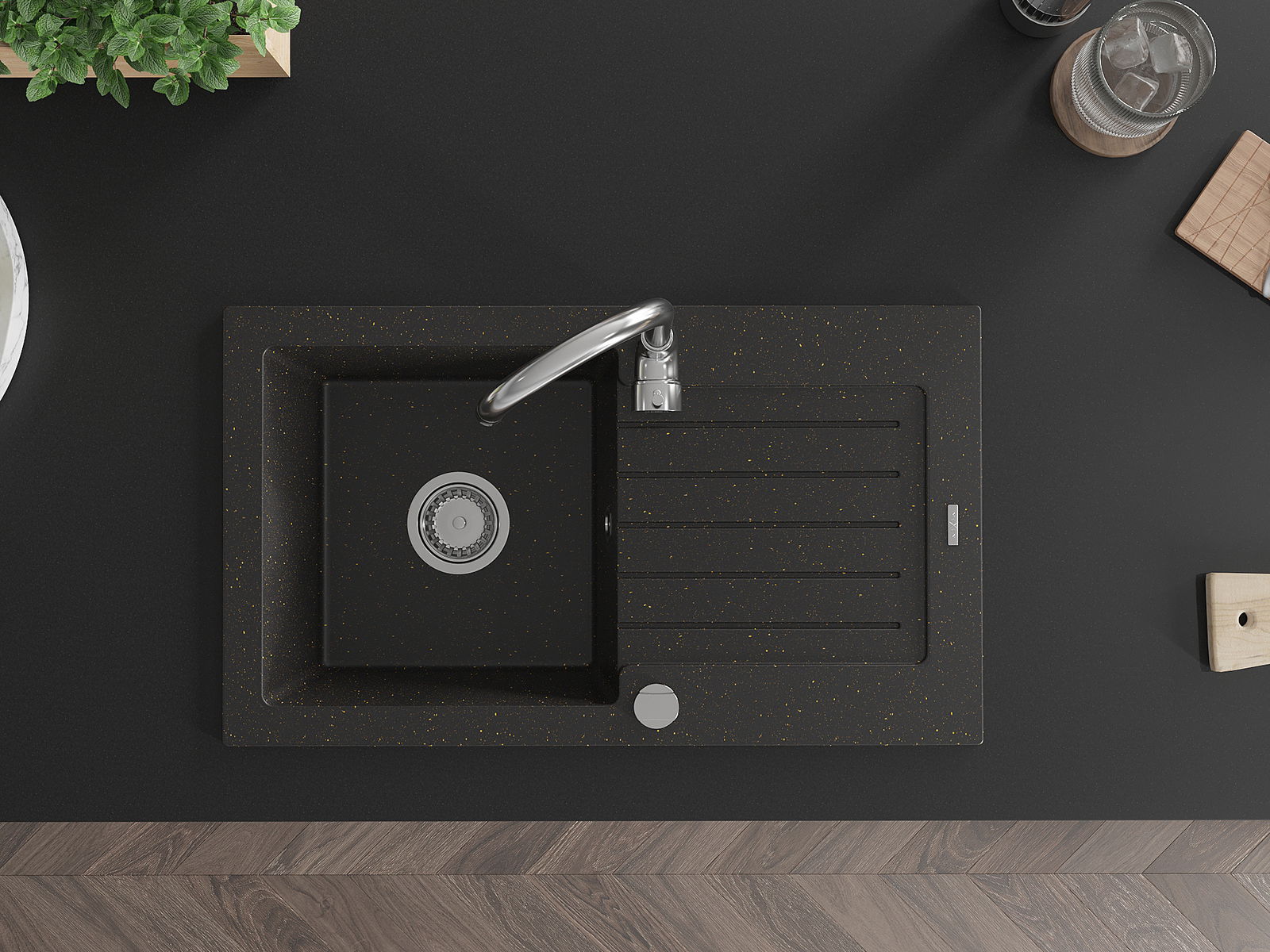 Mexen Pablo chiuvetă din granit cu 1 compartiment și picurător 752 x 436 mm, negru/auriu metalic, sifon crom - 6510751010-75