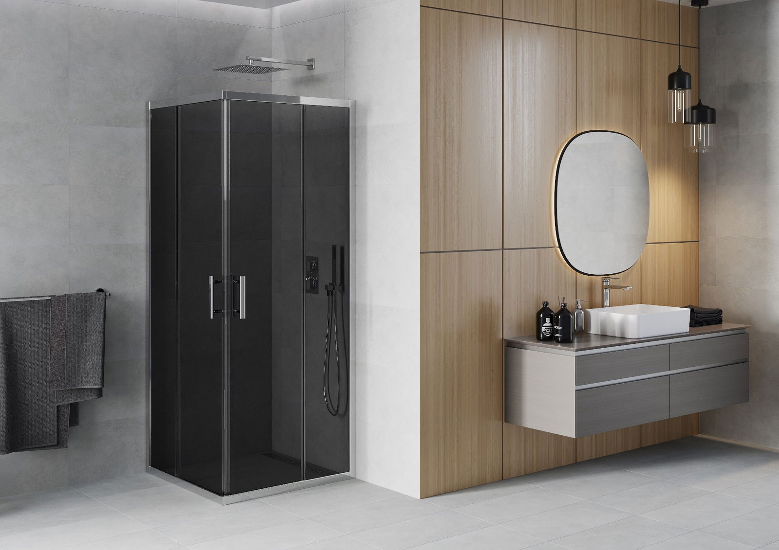 Mânerul practic și confortabil este realizat din metal durabil și rezistent. Forma modernă, combinată cu un finisaj asortat cu culoarea profilelor, conferă un aspect modern și elegant întregului, subliniind estetica fiecărei băi.