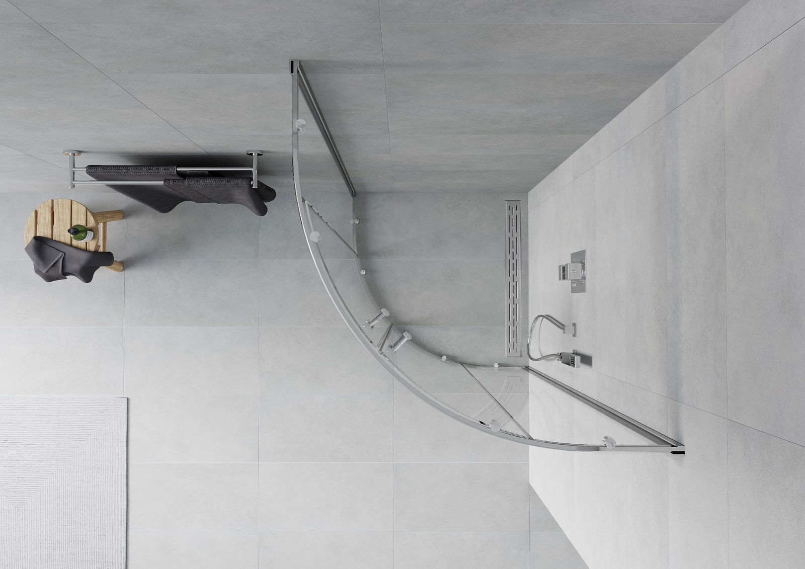 Produsul poate fi montat fie pe cabina de duș, fie direct pe podea, în funcție de nevoi. Metoda de montare universală permite adaptarea produsului la diferite tipuri de băi și configurații de spațiu.