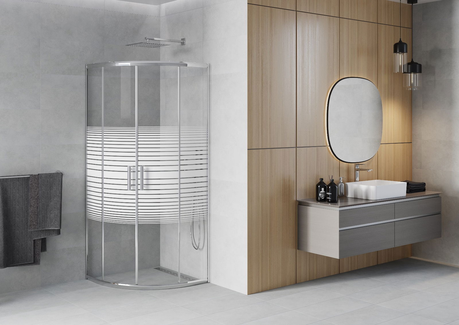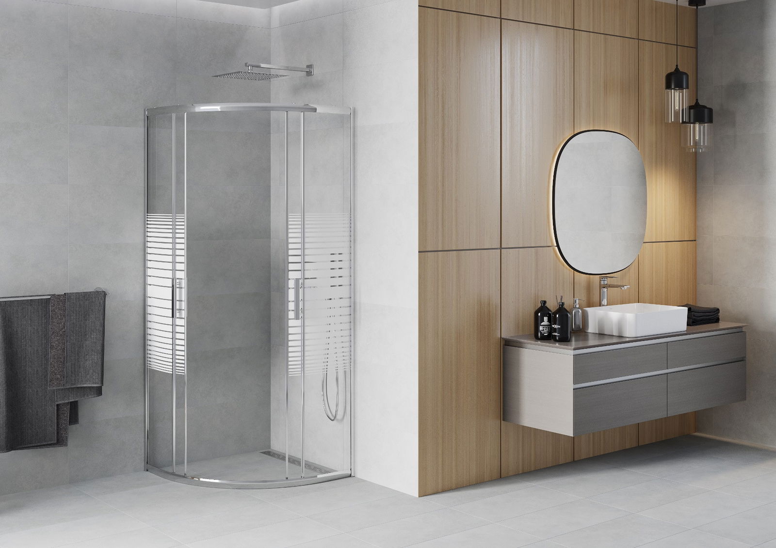 Mânerul practic și confortabil este realizat din metal durabil și rezistent. Forma modernă, combinată cu un finisaj asortat cu culoarea profilelor, conferă un aspect modern și elegant întregului, subliniind estetica fiecărei băi.