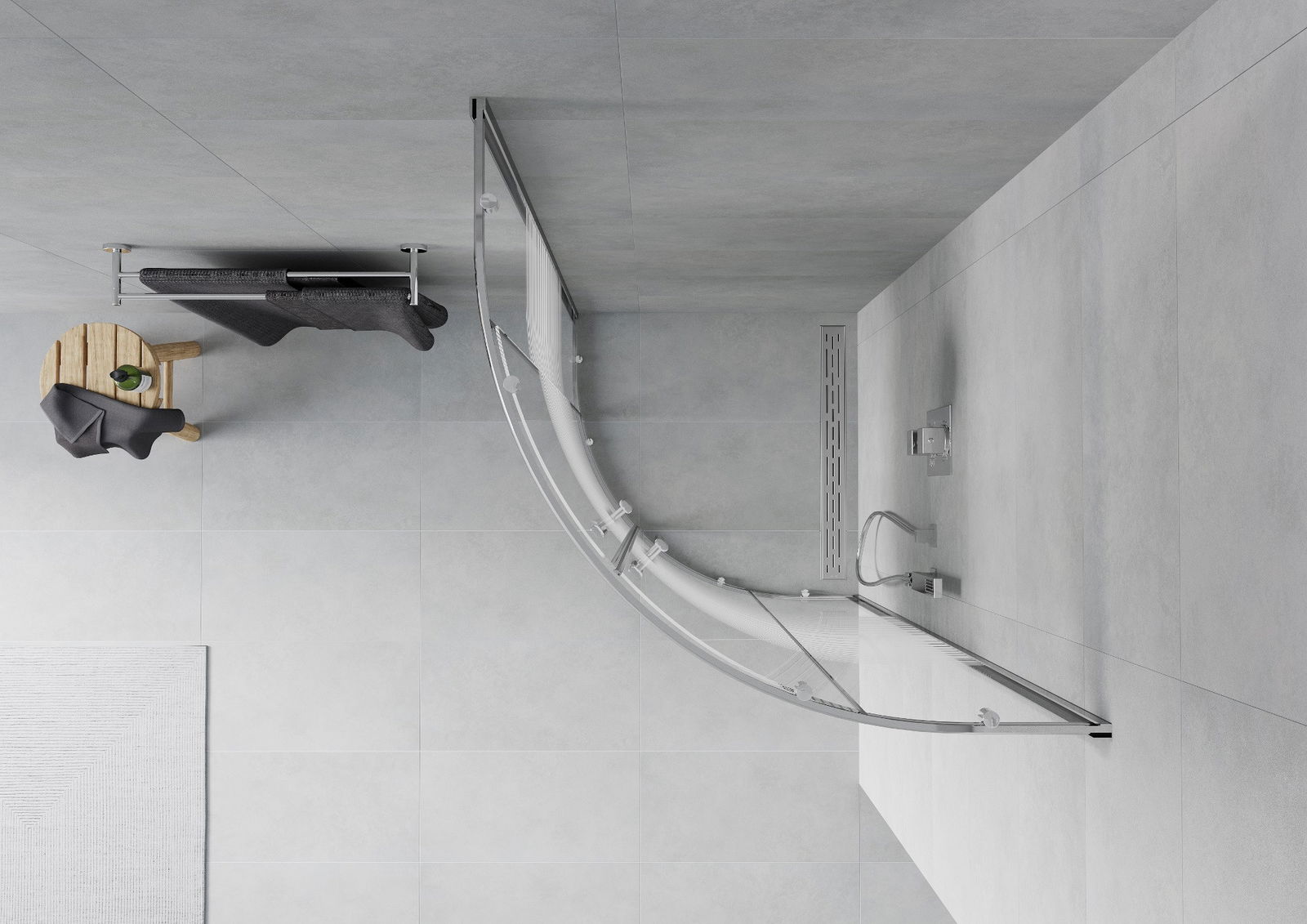 Produsul poate fi montat fie pe cabina de duș, fie direct pe podea, în funcție de nevoi. Metoda de montare universală permite adaptarea produsului la diferite tipuri de băi și configurații de spațiu.