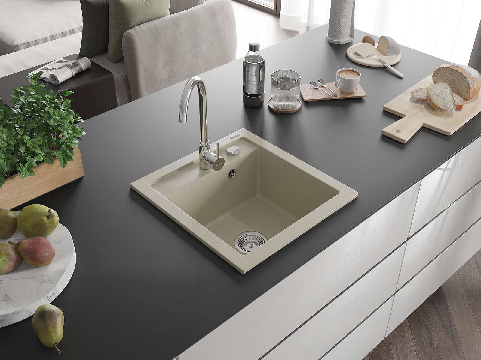 Suprafața chiuvetei este rezistentă la pete și decolorarea, datorită căreia este ușor de curățat și își păstrează culoarea mult timp. Estetică și practic completarea fiecărei bucătării.