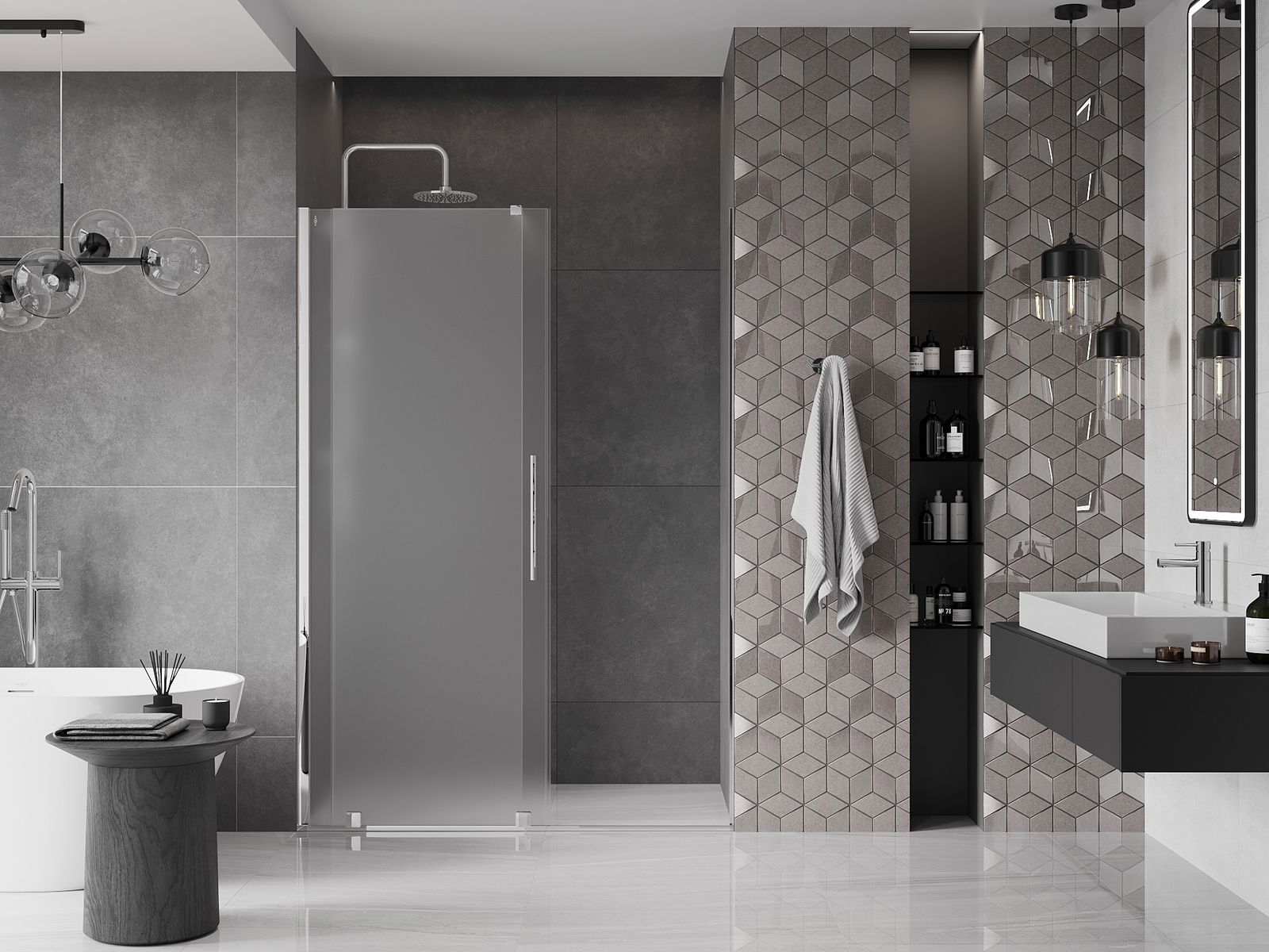 Mânerul practic și confortabil este realizat din oțel inoxidabil. Forma modernă, combinată cu un finisaj asortat cu culoarea profilelor, conferă ansamblului un aspect modern și elegant, subliniind estetica fiecărei băi.