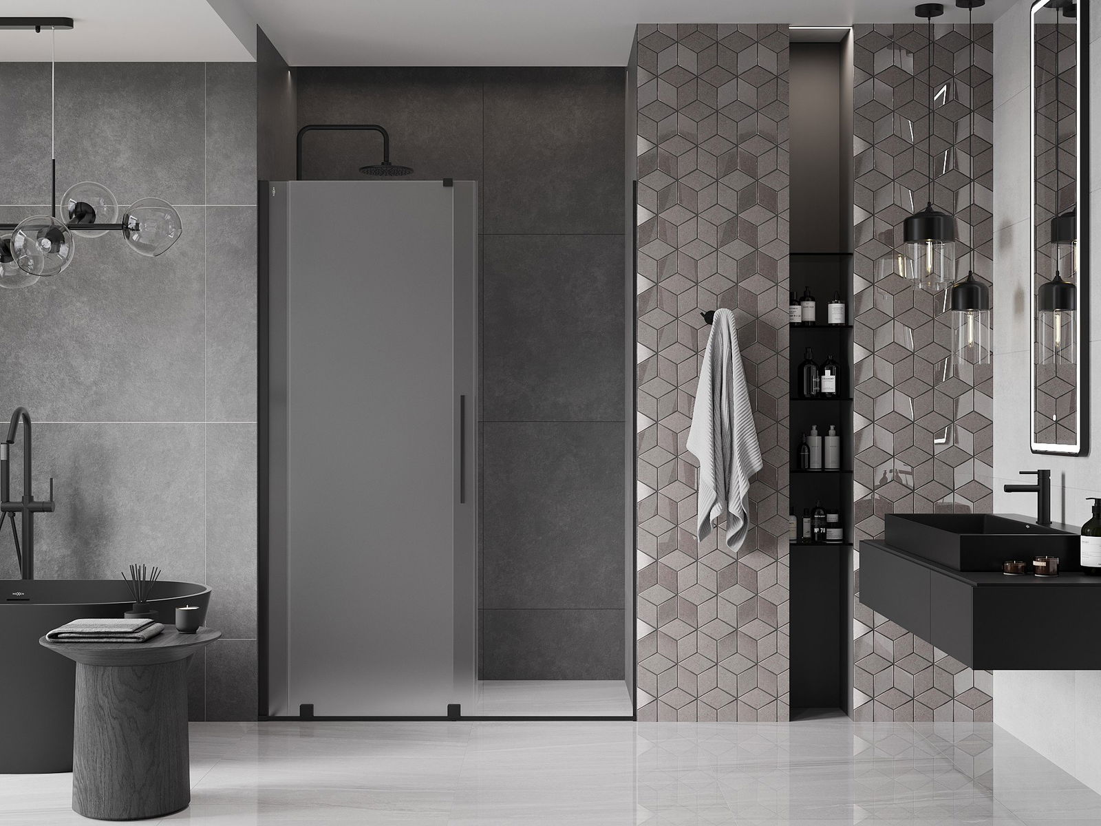 Mânerul practic și confortabil este realizat din oțel inoxidabil. Forma modernă, combinată cu un finisaj asortat cu culoarea profilelor, conferă ansamblului un aspect modern și elegant, subliniind estetica fiecărei băi.