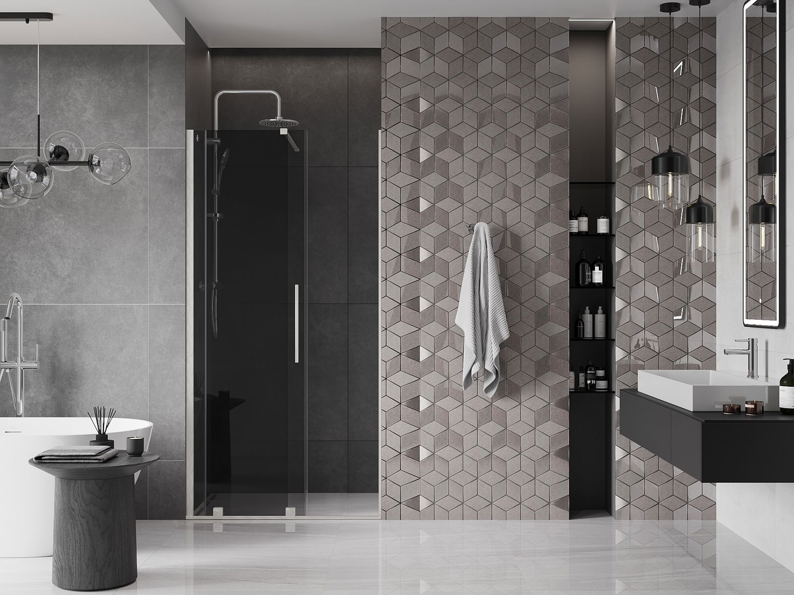Mânerul practic și confortabil este realizat din oțel inoxidabil. Forma modernă, combinată cu un finisaj asortat cu culoarea profilelor, conferă ansamblului un aspect modern și elegant, subliniind estetica fiecărei băi.