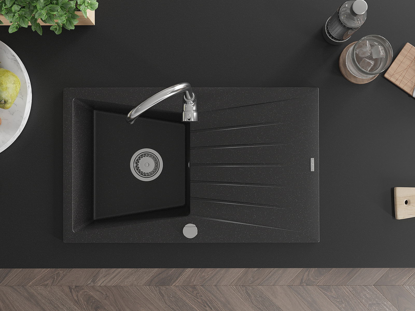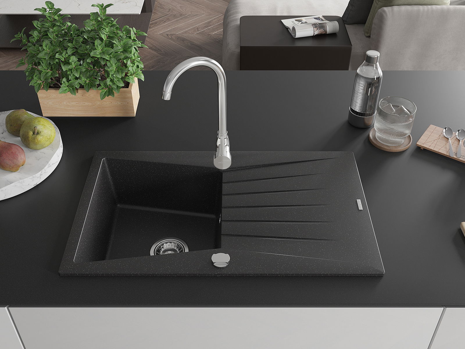 Mexen Cesar chiuvetă de granit cu o singură cuvă cu scurgător, 775 x 470 mm, negru/argintiu metalizat, sifon crom