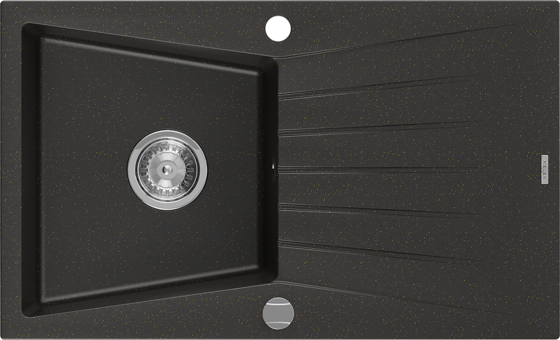 Mexen Cesar chiuvetă de granit cu 1 compartiment și scurgător 775 x 470 mm, negru/auriu metalizat, sifon cromat - 6514771010-75