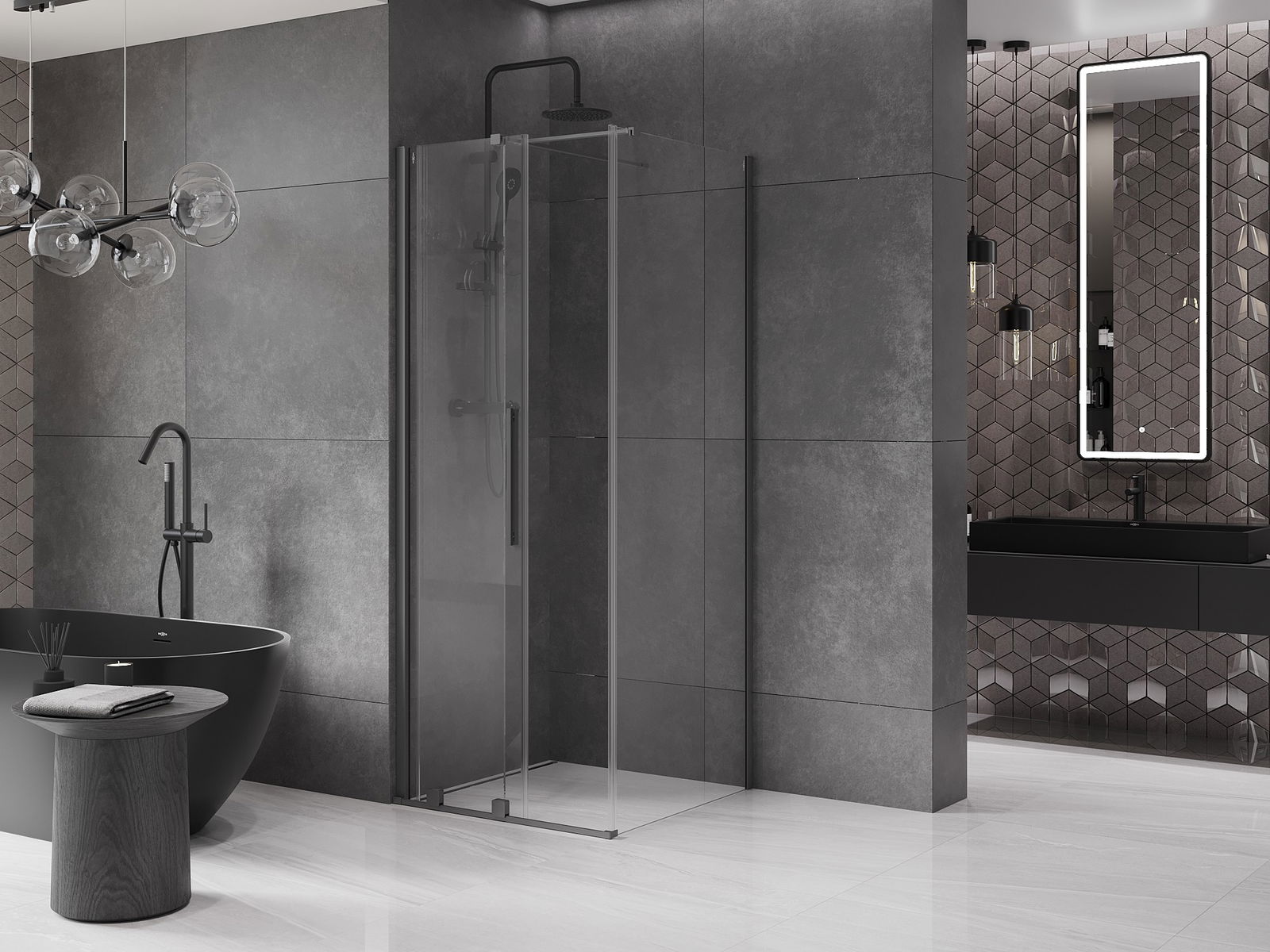 Mânerul practic și confortabil este realizat din oțel inoxidabil. Forma modernă, combinată cu un finisaj asortat cu culoarea profilelor, conferă ansamblului un aspect modern și elegant, subliniind estetica fiecărei băi.