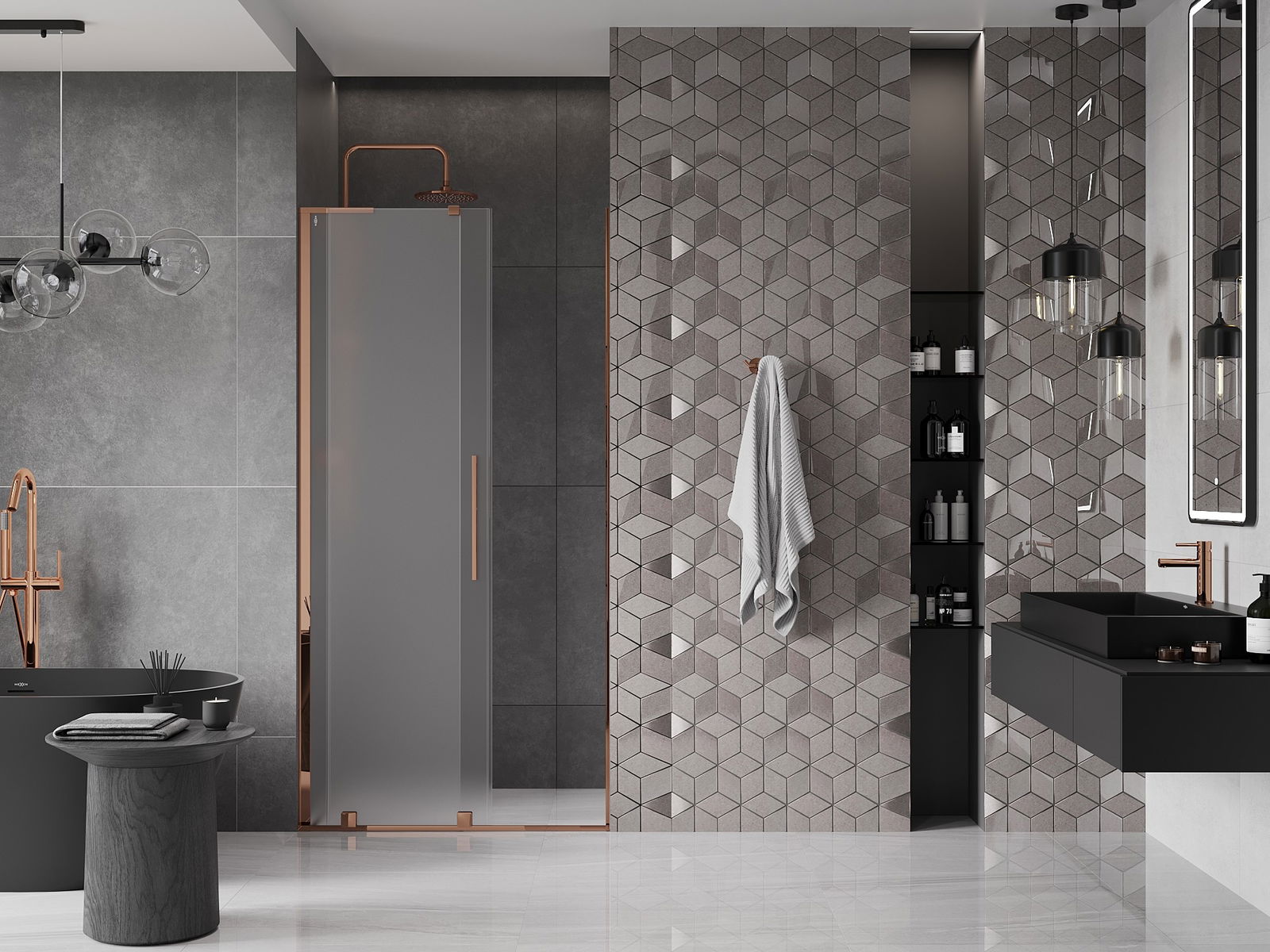 Mânerul practic și confortabil este realizat din oțel inoxidabil. Forma modernă, combinată cu un finisaj asortat cu culoarea profilelor, conferă ansamblului un aspect modern și elegant, subliniind estetica fiecărei băi.