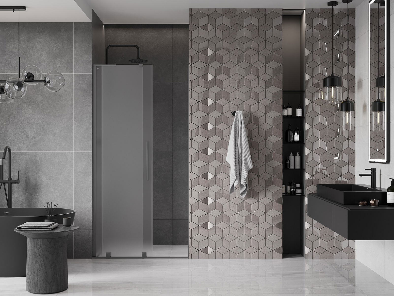Mânerul practic și confortabil este realizat din oțel inoxidabil. Forma modernă, combinată cu un finisaj asortat cu culoarea profilelor, conferă ansamblului un aspect modern și elegant, subliniind estetica fiecărei băi.