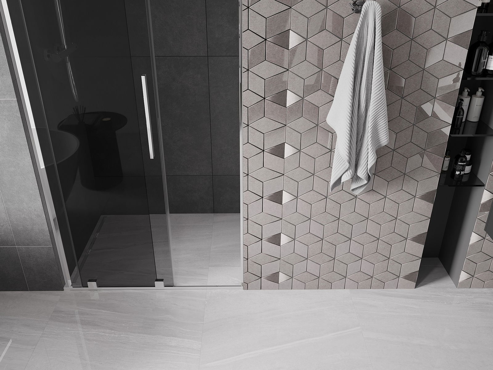 Mânerul practic și confortabil este realizat din oțel inoxidabil. Forma modernă, combinată cu un finisaj asortat cu culoarea profilelor, conferă ansamblului un aspect modern și elegant, subliniind estetica fiecărei băi.