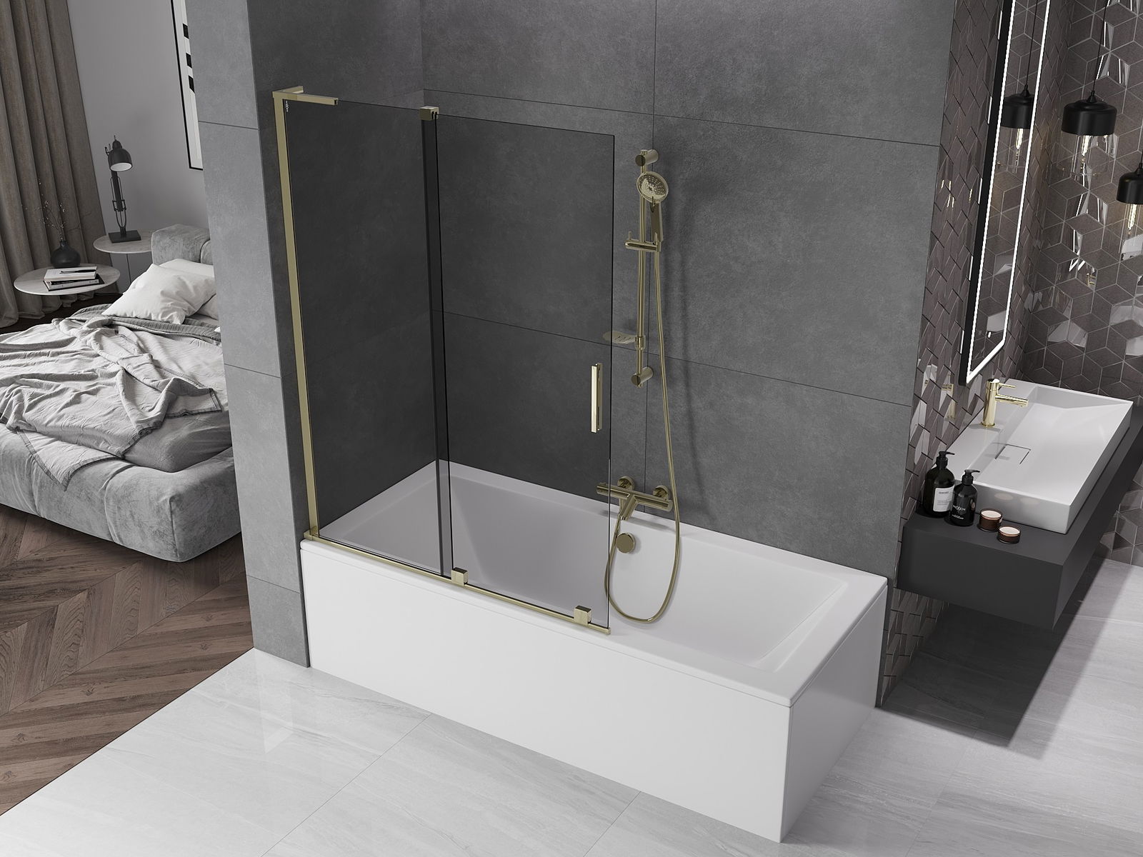 Mexen Velar L paravan cadă cu 2 uși glisante 120 x 150 cm, grafit, auriu - 896-120-003-41-50