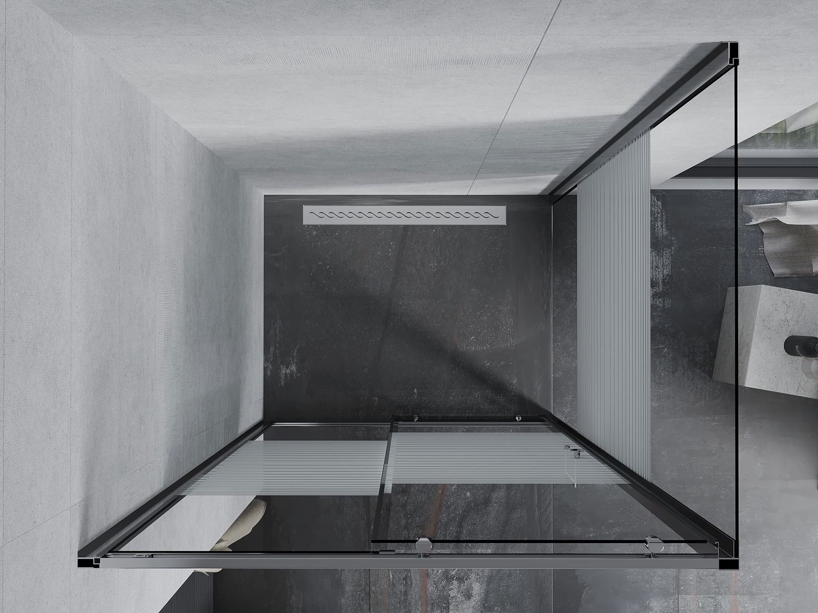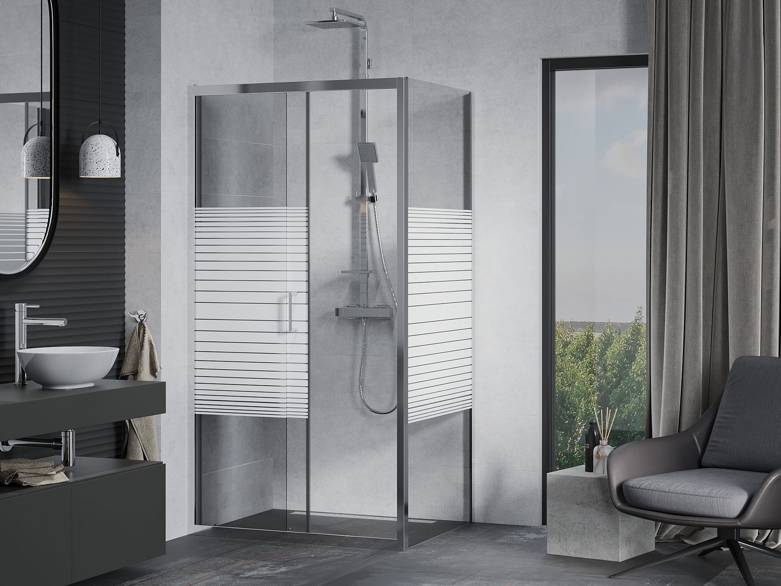 Mânerul practic și confortabil este realizat din metal durabil și rezistent. Forma modernă, combinată cu un finisaj asortat cu culoarea profilelor, conferă un aspect modern și elegant întregului, subliniind estetica fiecărei băi.