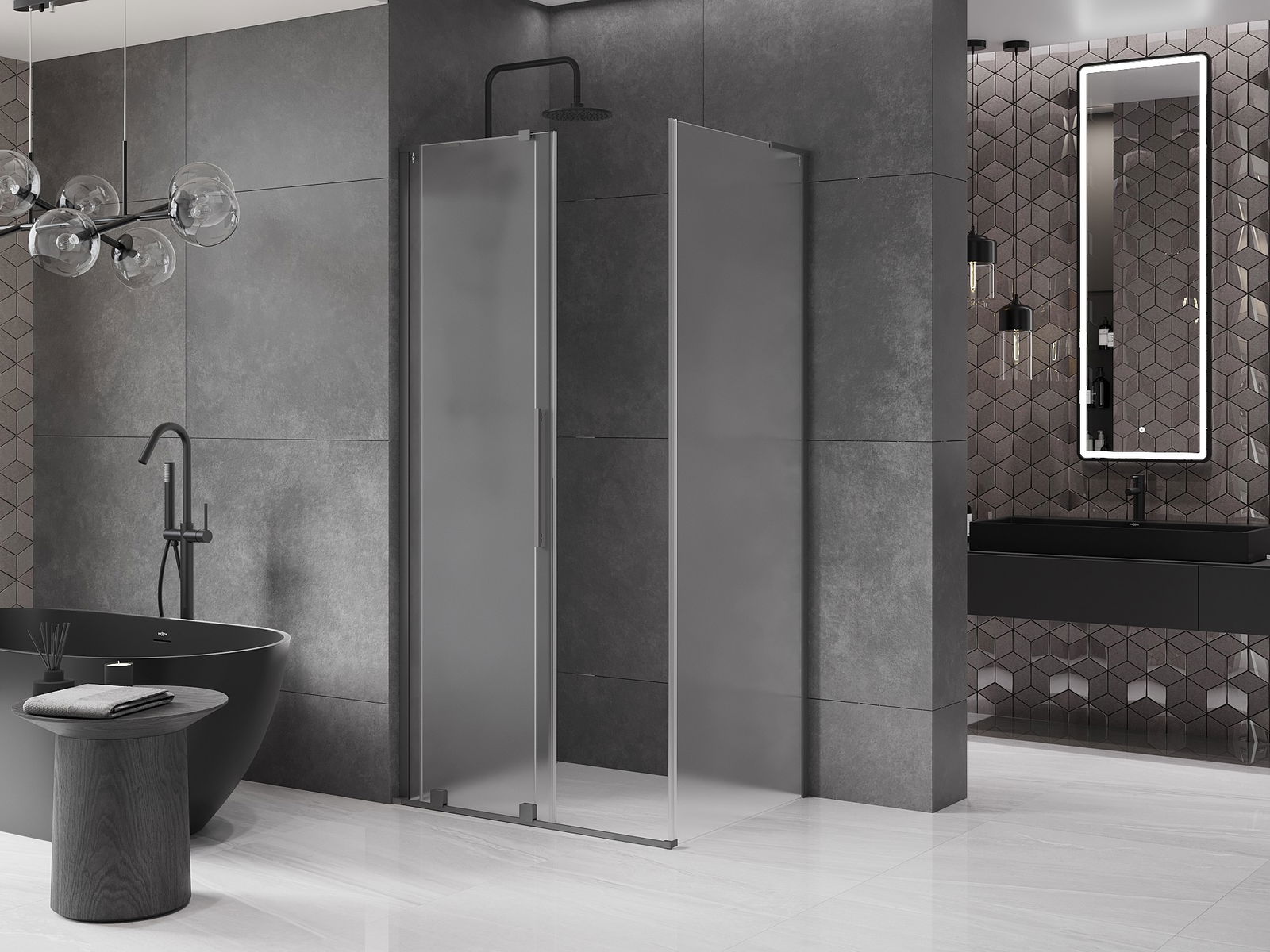 Mânerul practic și confortabil este realizat din oțel inoxidabil. Forma modernă, combinată cu un finisaj asortat cu culoarea profilelor, conferă ansamblului un aspect modern și elegant, subliniind estetica fiecărei băi.