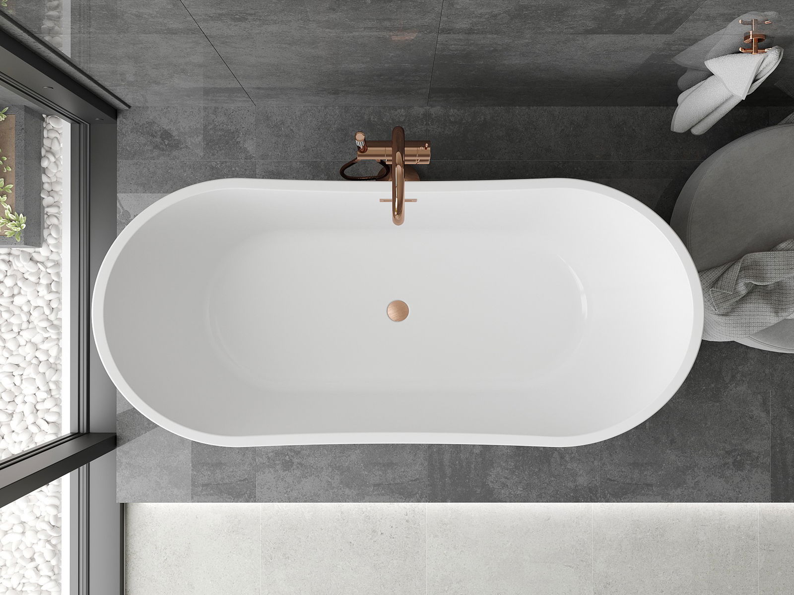 Cadă freestanding este soluția ideală pentru orice baie modernă. Dimensiunile sale de 170 x 80 cm și înălțimea de 72 cm asigură confortul utilizării. Fabricată din acril sanitar, este rezistentă la matuire și radiații UV, garantând strălucirea de durată. Forma ovală și culoarea alb imaculat se potrivesc perfect în estetica interioarelor contemporane. În plus, cuprul periat în elementele de finisaj subliniază aspectul său elegant. Include sifon și dop clic-clac.