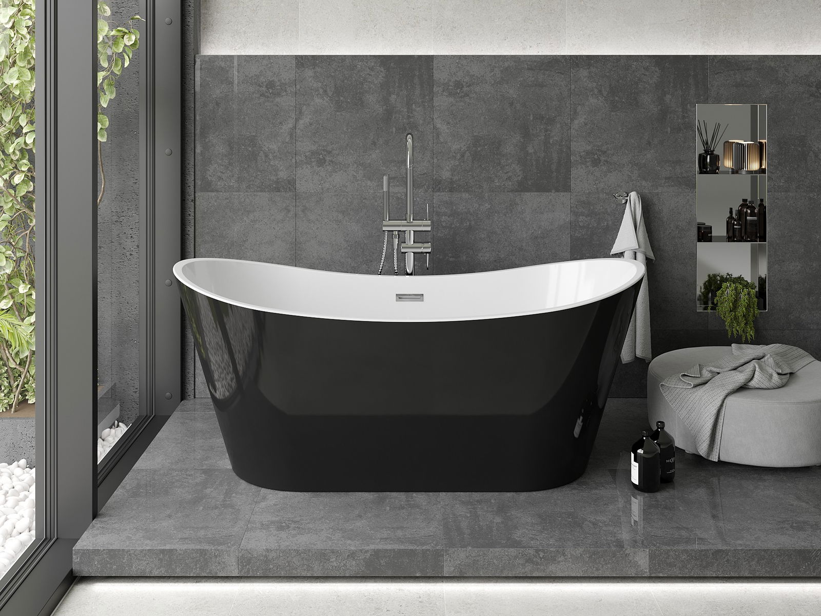 Cadă freestanding cu dimensiuni de 180 x 80 cm, o alegere excelentă pentru cei care apreciază eleganța și confortul. Fabricată din acril sanitar, combinația de culori alb-negru împreună cu finisajul cromat creează un design modern. Forma ovală și luciul suprafeței îi conferă un aspect deosebit. Cada este echipată cu orificiu de preaplin și sifon, ceea ce asigură ușurința în utilizare. Datorită rezistenței la mătuire și la radiațiile UV, își păstrează estetica pentru mult timp.