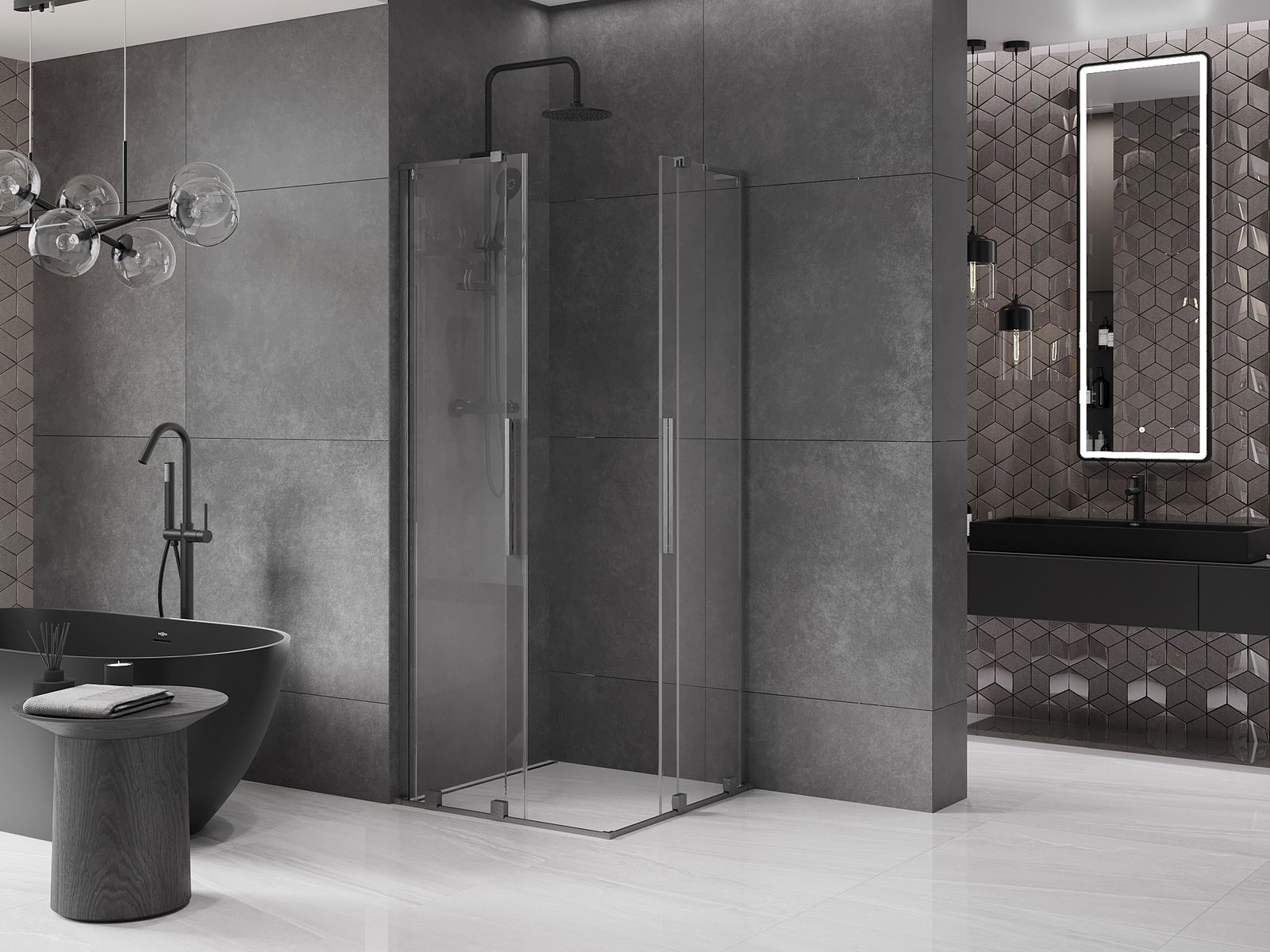 Mânerul practic și confortabil este realizat din oțel inoxidabil. Forma modernă, combinată cu un finisaj asortat cu culoarea profilelor, conferă ansamblului un aspect modern și elegant, subliniind estetica fiecărei băi.