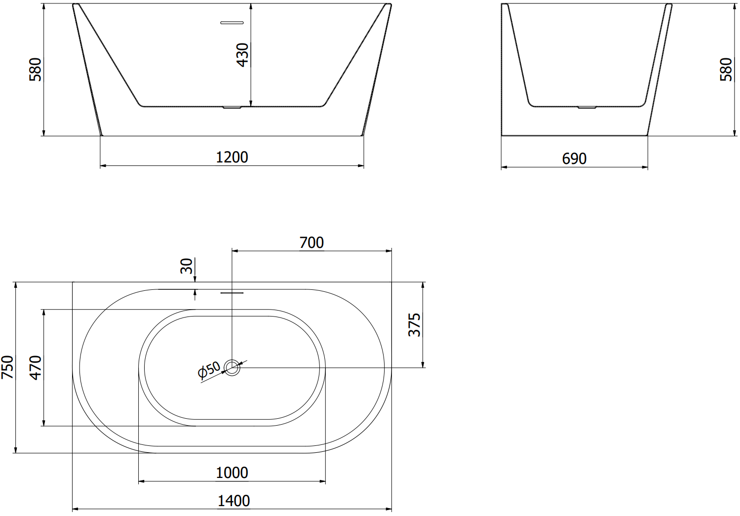 Mexen Oval cadă de sine stătătoare montată pe perete 140 x 75 cm, alb/negru, preaplin alb - 52671407575-20